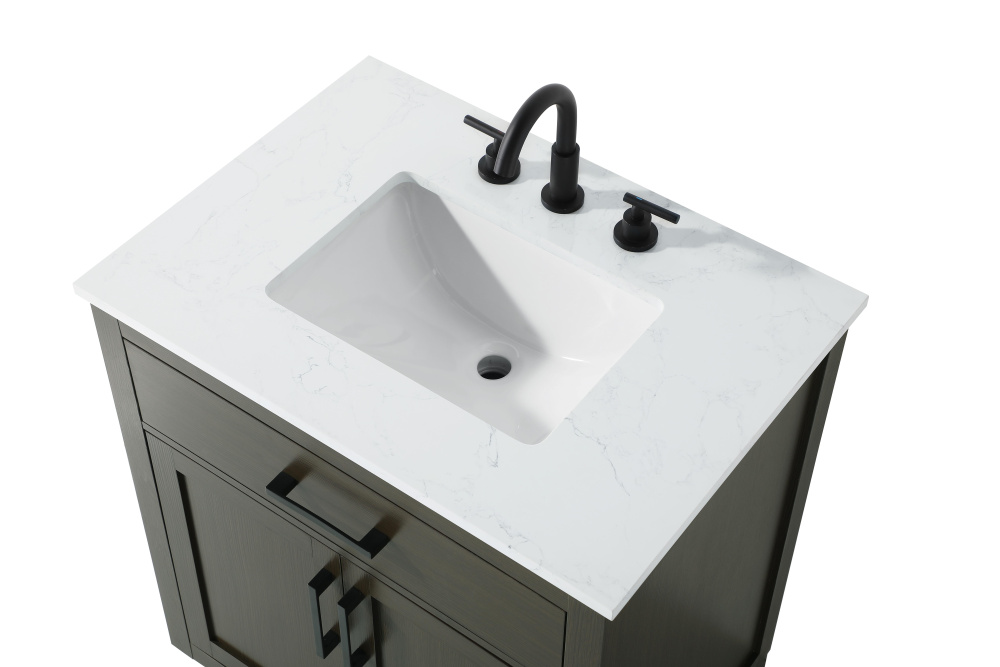 Engineered marble countertop with subtle grey marbling adds sophistication.