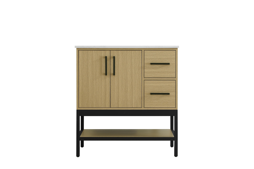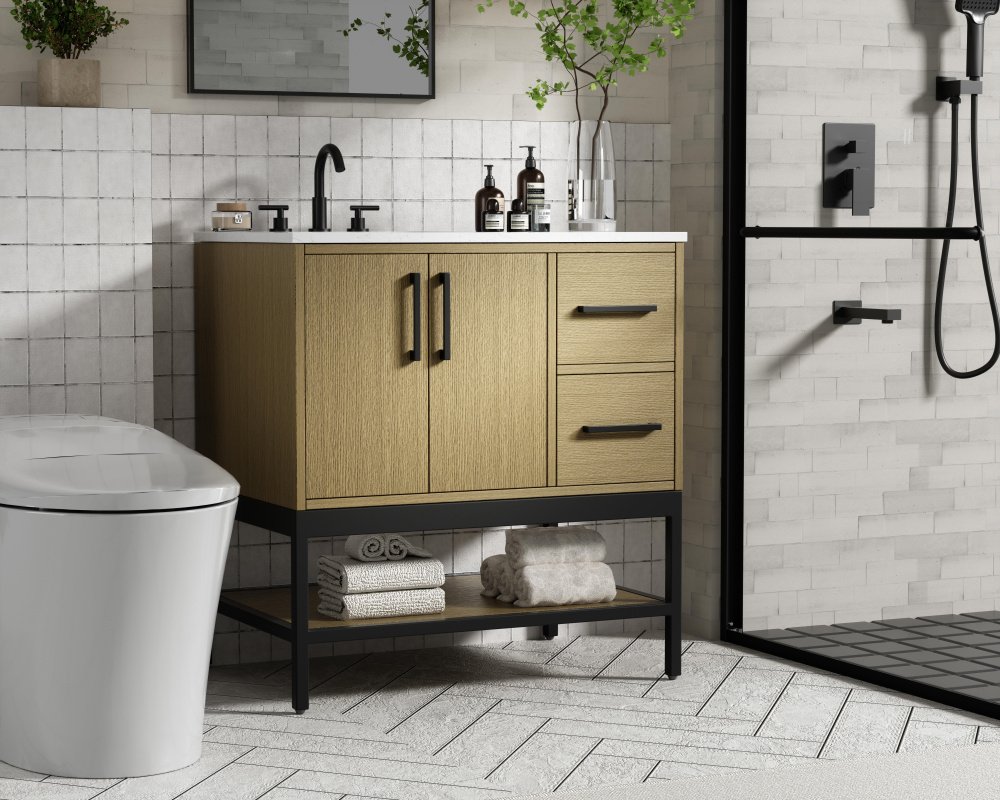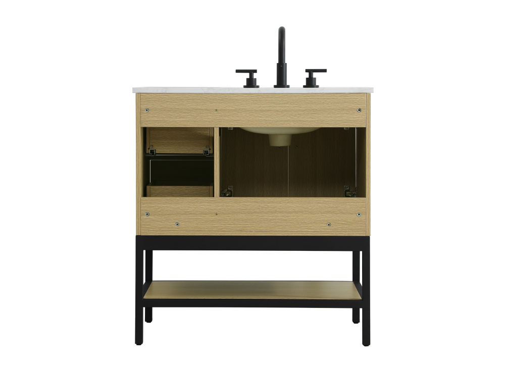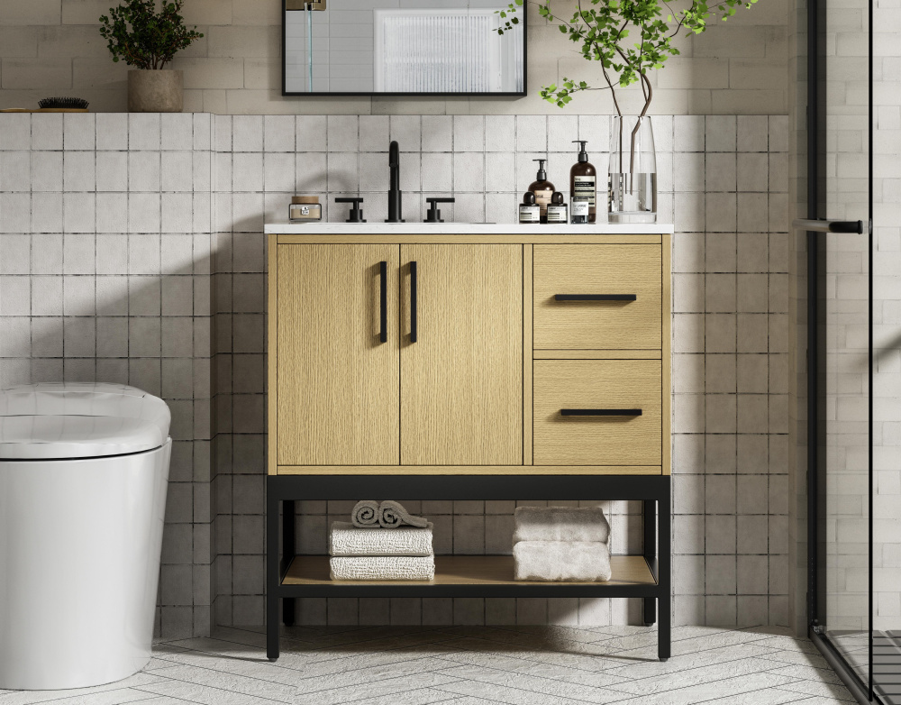 Upgrade your bathroom with this modern bathroom vanity that combines form and function effortlessly. Its sleek wood veneer cabinetry, paired with a bold black metal frame, brings a clean, contemporary vibe to any space. Designed with practicality in mind, the cabinet organizes your essentials, as well as an open lower shelf for added storage or display. The durable engineered marble countertop is built to withstand daily use, while the undermount porcelain sink ensures easy maintenance. Complete with matte black hardware and pre-drilled features for effortless installation, this vanity is the perfect centerpiece to refresh your bathroom with style and efficiency.