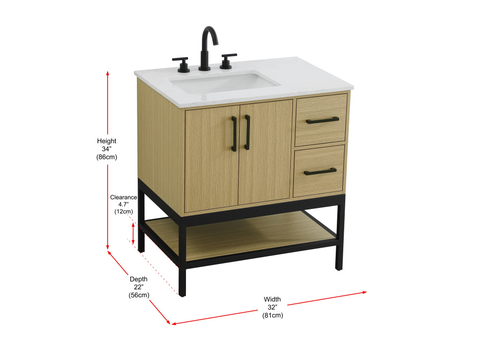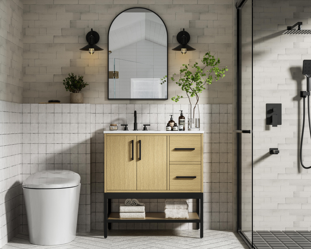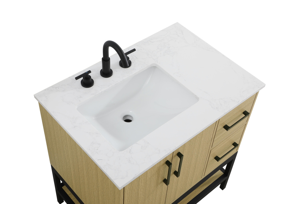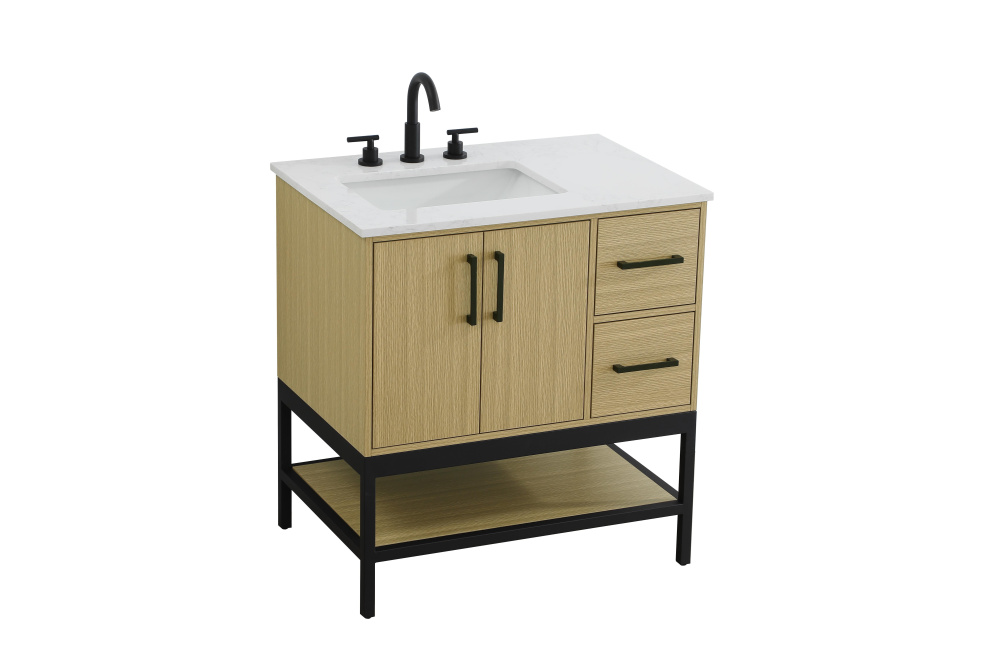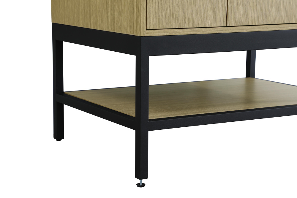 Upgrade your bathroom with this modern bathroom vanity that combines form and function effortlessly. Its sleek wood veneer cabinetry, paired with a bold black metal frame, brings a clean, contemporary vibe to any space. Designed with practicality in mind, the cabinet organizes your essentials, as well as an open lower shelf for added storage or display. The durable engineered marble countertop is built to withstand daily use, while the undermount porcelain sink ensures easy maintenance. Complete with matte black hardware and pre-drilled features for effortless installation, this vanity is the perfect centerpiece to refresh your bathroom with style and efficiency.