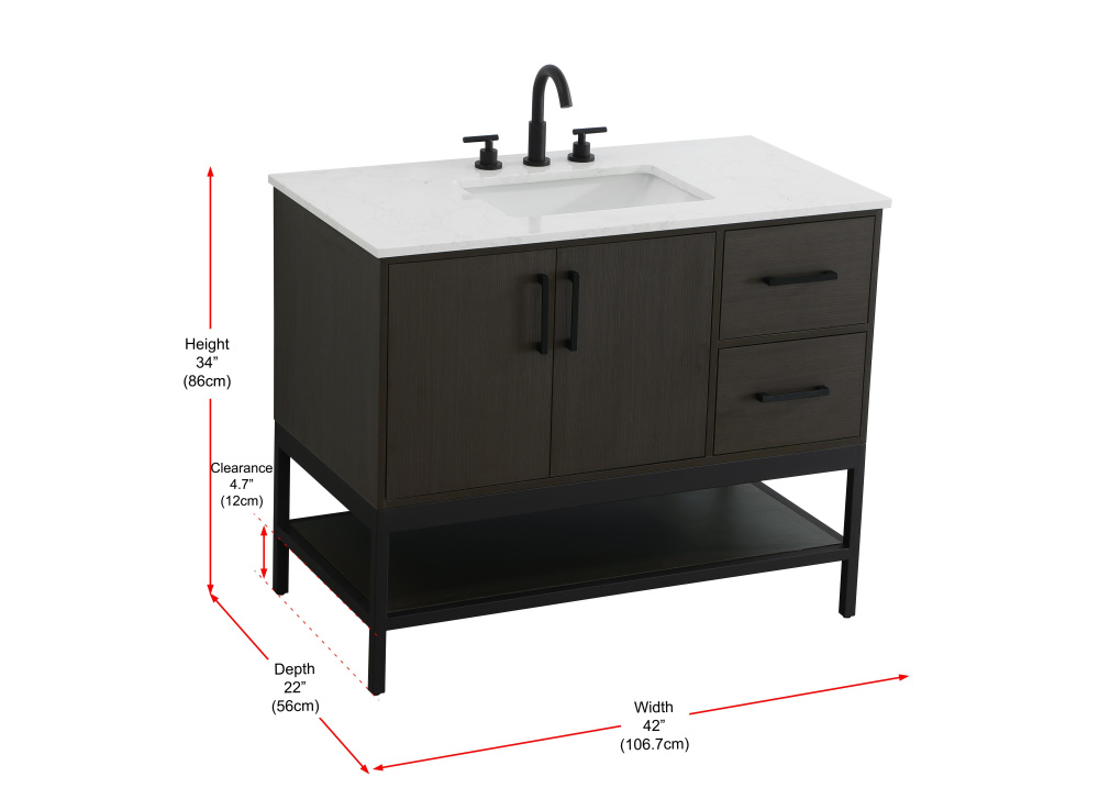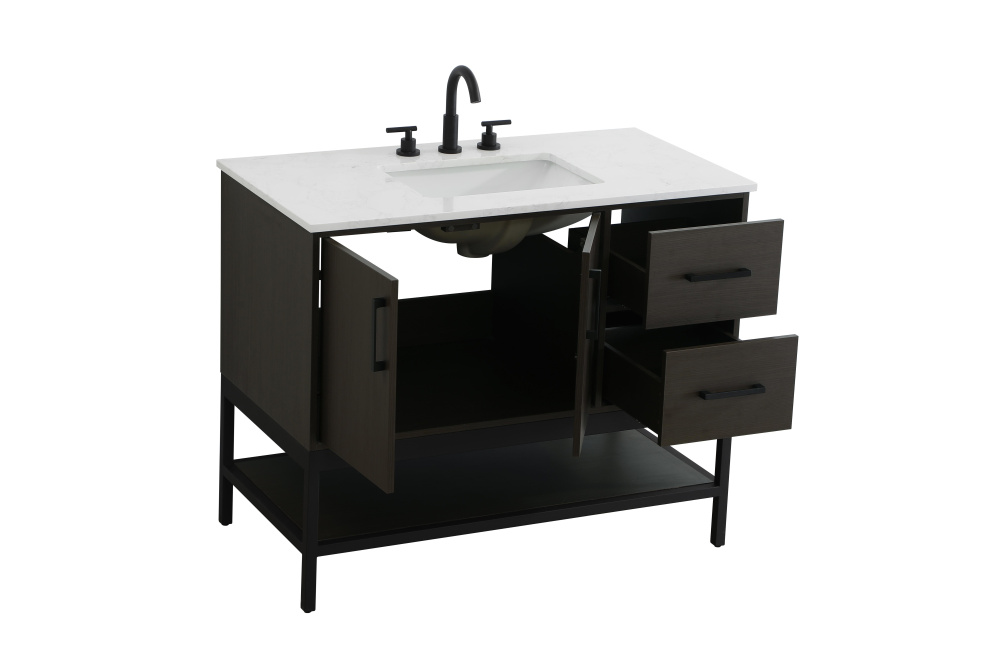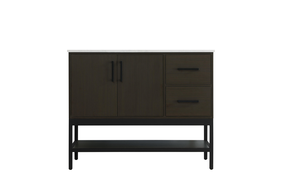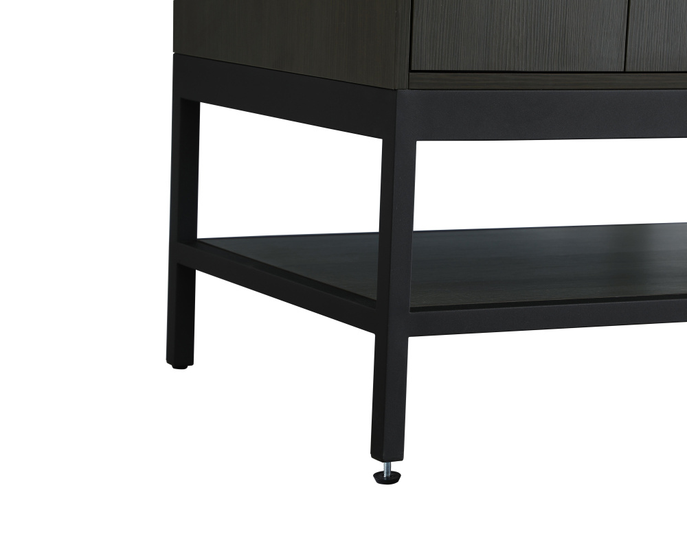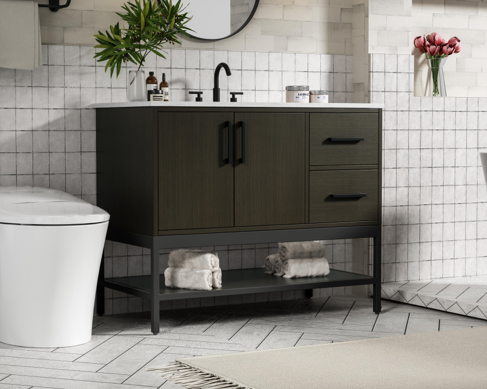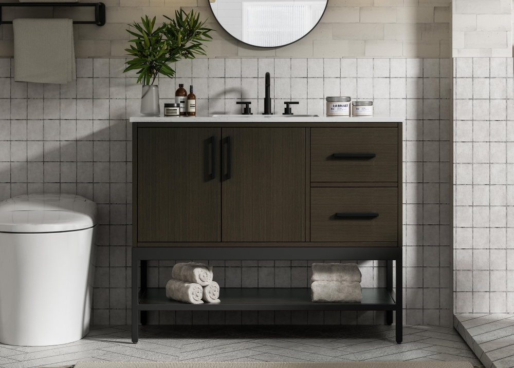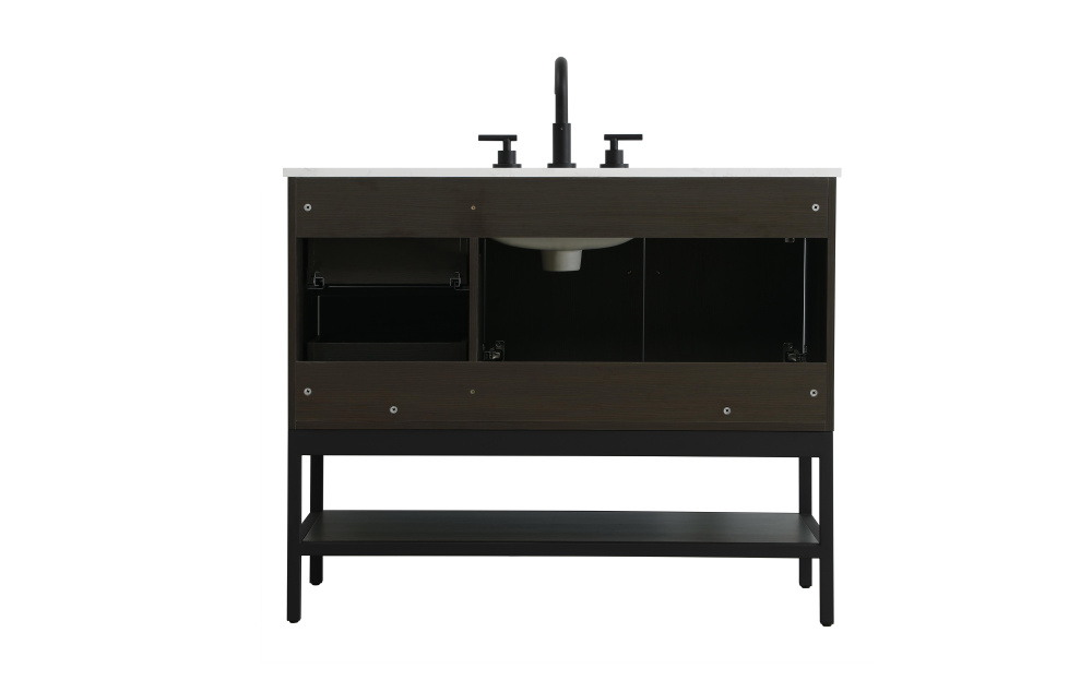 Upgrade your bathroom with this modern bathroom vanity that combines form and function effortlessly. Its sleek wood veneer cabinetry, paired with a bold black metal frame, brings a clean, contemporary vibe to any space. Designed with practicality in mind, this vanity offers soft-close drawers and cabinets to organize your essentials, as well as an open lower shelf for added storage or display. The durable white quartz countertop is built to withstand daily use, while the undermount ceramic sink ensures easy maintenance. Complete with matte black hardware and pre-drilled features for effortless installation, this vanity is the perfect centerpiece to refresh your bathroom with style and efficiency.