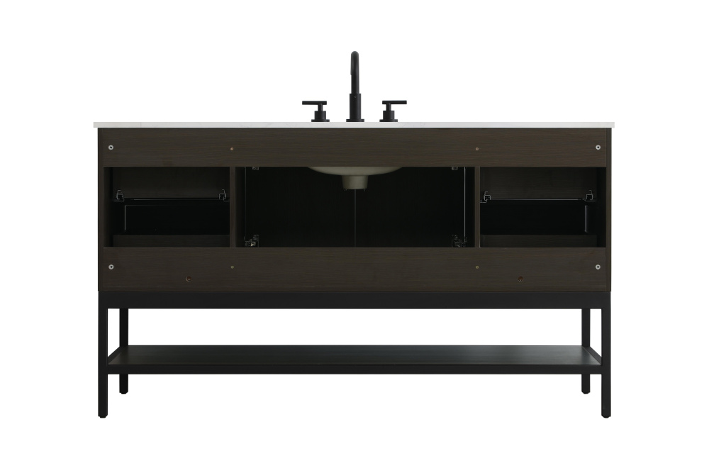 Upgrade your bathroom with this modern bathroom vanity that combines form and function effortlessly. Its sleek wood veneer cabinetry, paired with a bold black metal frame, brings a clean, contemporary vibe to any space. Designed with practicality in mind, this vanity offers soft-close drawers and cabinets to organize your essentials, as well as an open lower shelf for added storage or display. The durable white quartz countertop is built to withstand daily use, while the undermount ceramic sink ensures easy maintenance. Complete with matte black hardware and pre-drilled features for effortless installation, this vanity is the perfect centerpiece to refresh your bathroom with style and efficiency.