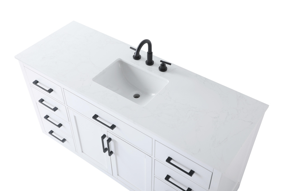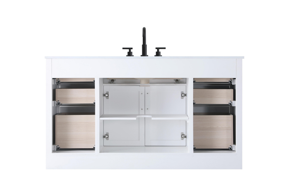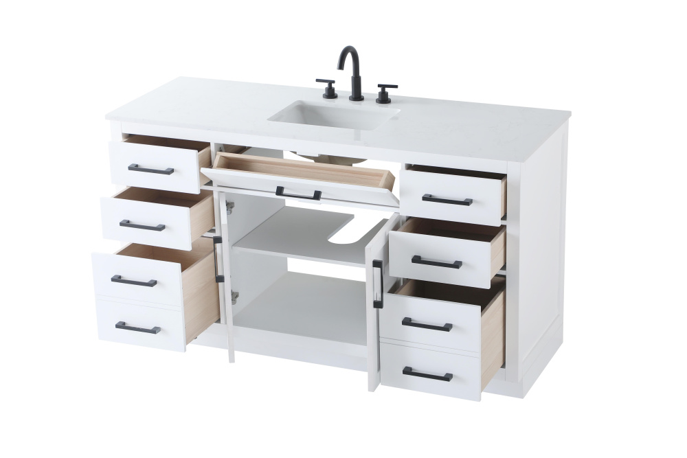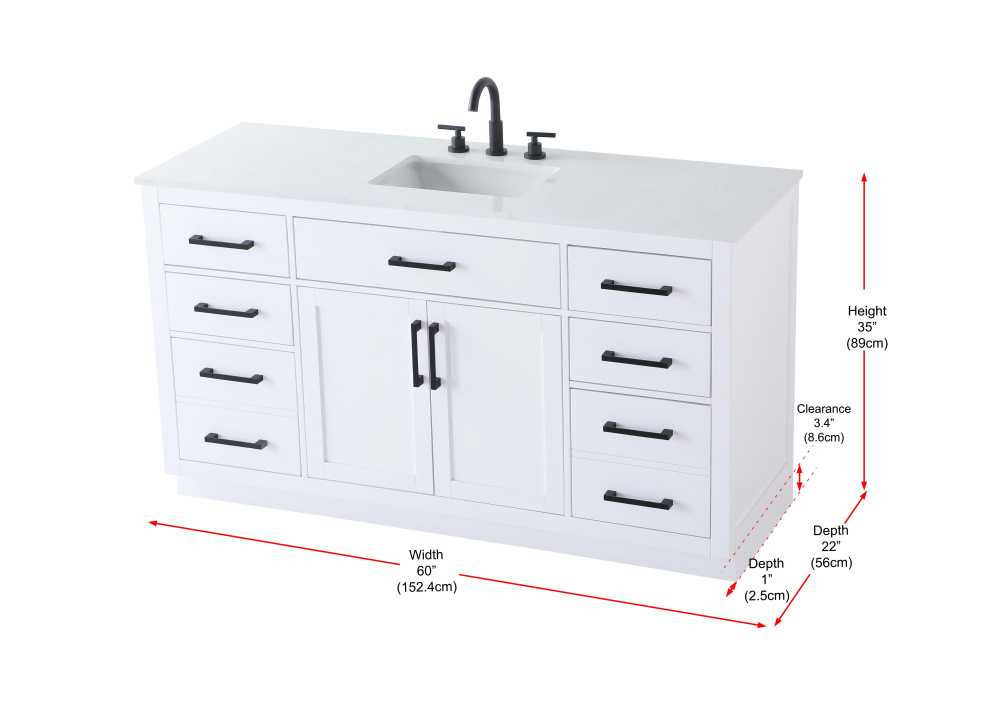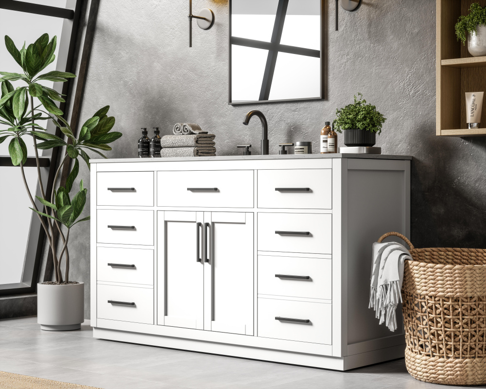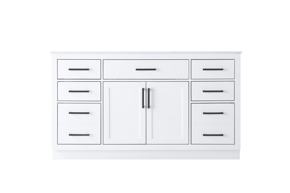 Introduce a perfect balance of functionality and style to your bathroom with this thoughtfully designed vanity. Constructed with a combination of solid wood and MDF, it offers durability and a sturdy build. The sleek engineered marble countertop with subtle grey marbling complements the rustic wood grain finish, creating a stylish and inviting centerpiece for your bathroom. Designed in a contemporary style with a transitional flair, it features a U-shaped shelf for seamless plumbing integration and multiple soft-close drawers for clutter-free organization. A pull-down drawer enhances convenience, while the toe kick adds a refined, clean-lined appearance and simplifies cleaning underneath. Matte black hardware contrasts beautifully with the cabinet finish, tying the look together. Delivered fully assembled and equipped with foot levelers, this vanity combines practicality and aesthetic appeal to suit modern and transitional bathrooms alike.