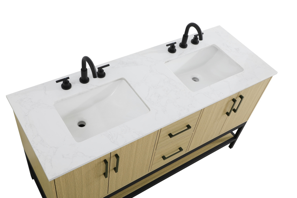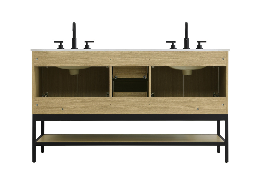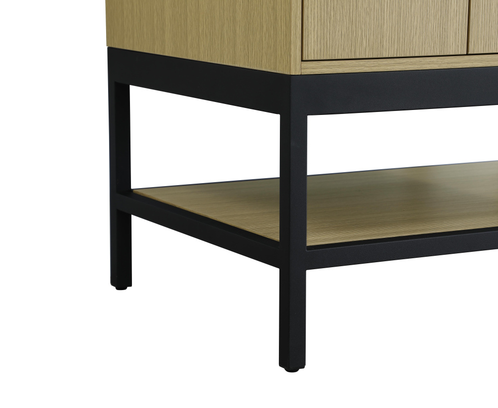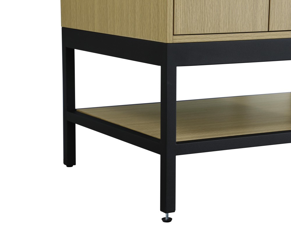 Upgrade your bathroom with this modern bathroom vanity that combines form and function effortlessly. Its sleek wood veneer cabinetry, paired with a bold black metal frame, brings a clean, contemporary vibe to any space. Designed with practicality in mind, this vanity offers soft-close drawers and cabinets to organize your essentials, as well as an open lower shelf for added storage or display. The durable white quartz countertop is built to withstand daily use, while the undermount ceramic sink ensures easy maintenance. Complete with matte black hardware and pre-drilled features for effortless installation, this vanity is the perfect centerpiece to refresh your bathroom with style and efficiency.