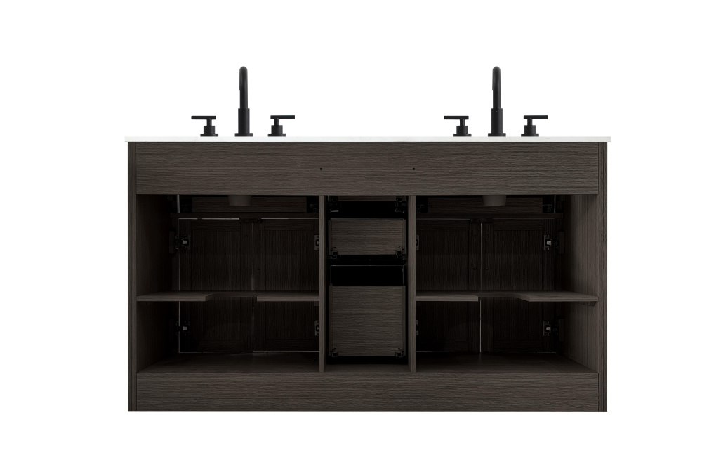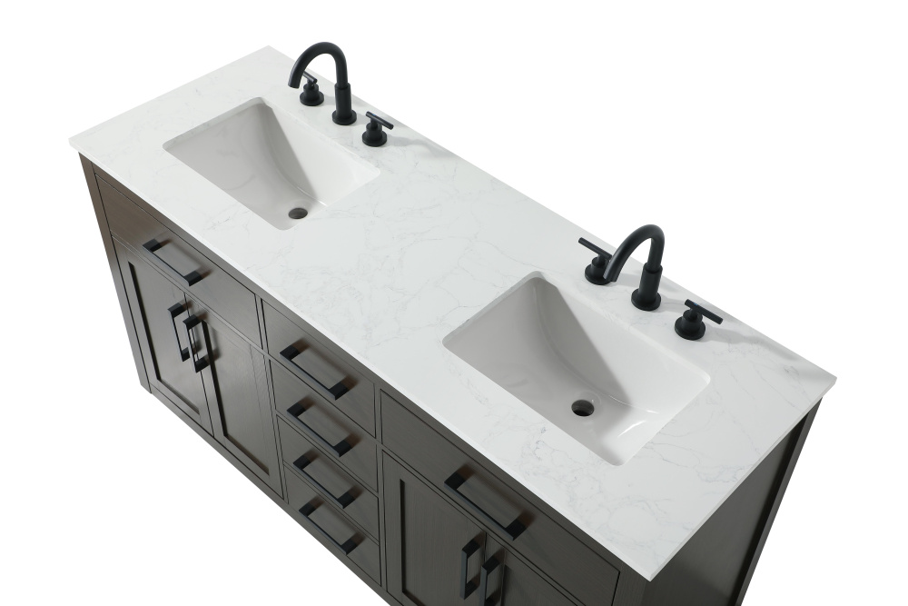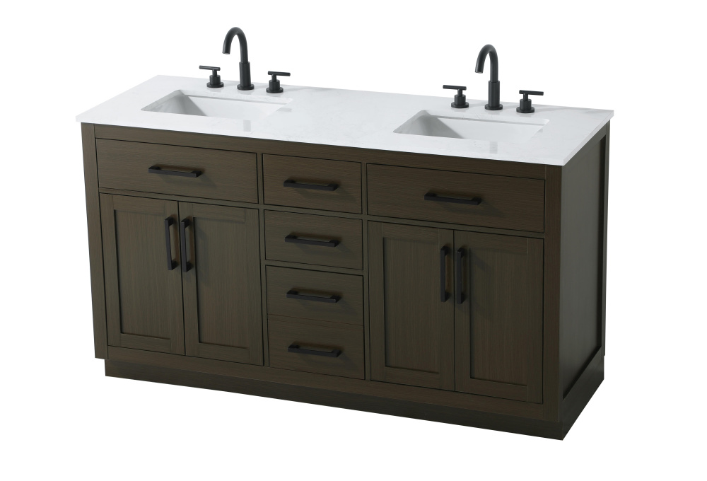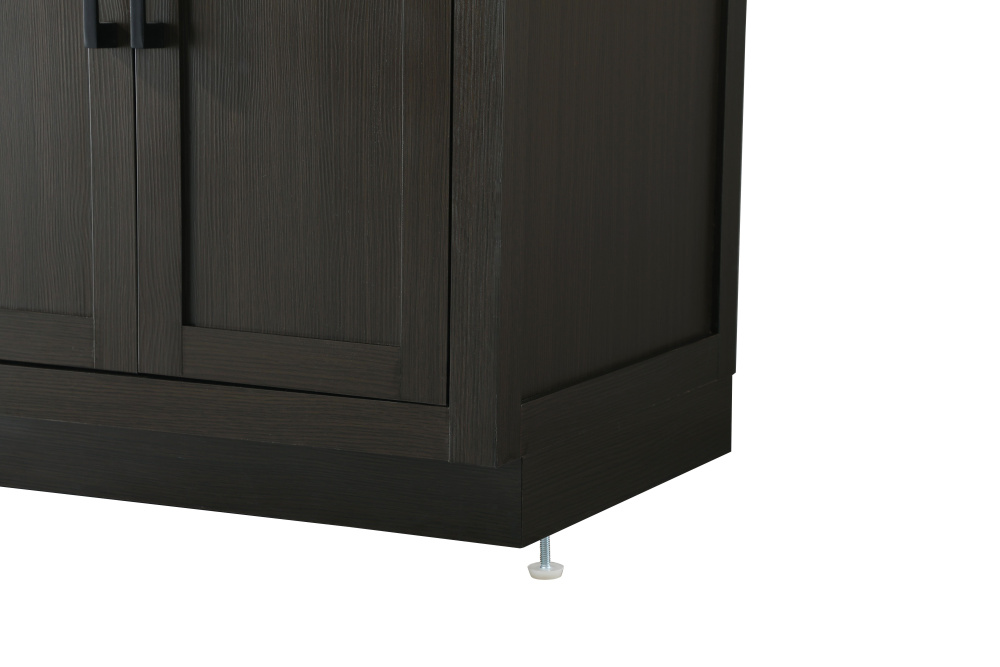 Introduce a perfect balance of functionality and style to your bathroom with this thoughtfully designed vanity. Constructed with a combination of solid wood and MDF, it offers durability and a sturdy build. The sleek engineered marble countertop with subtle grey marbling complements the rustic wood grain finish, creating a stylish and inviting centerpiece for your bathroom. Designed in a contemporary style with a transitional flair, it features a U-shaped shelf for seamless plumbing integration and multiple soft-close drawers for clutter-free organization. A pull-down drawer enhances convenience, while the toe kick adds a refined, clean-lined appearance and simplifies cleaning underneath. Matte black hardware contrasts beautifully with the cabinet finish, tying the look together. Delivered fully assembled and equipped with foot levelers, this vanity combines practicality and aesthetic appeal to suit modern and transitional bathrooms alike.