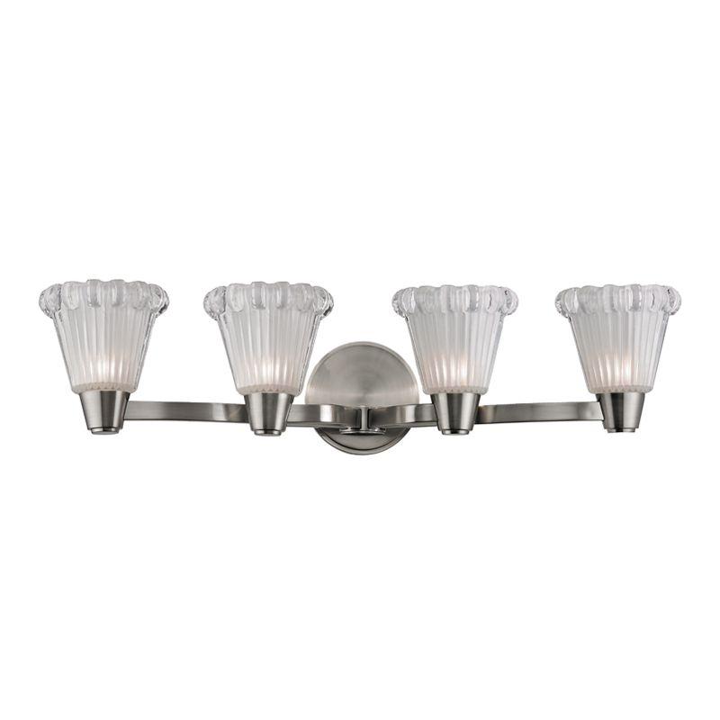Embodying the resurgent glamour of postwar America, Varick’s custom glass is crowned with a thick ring of glimmering facets. We etch the pressed shade’s fluted body for soft diffusion, leaving the faceted cornice clear to enhance its refractive brilliance.