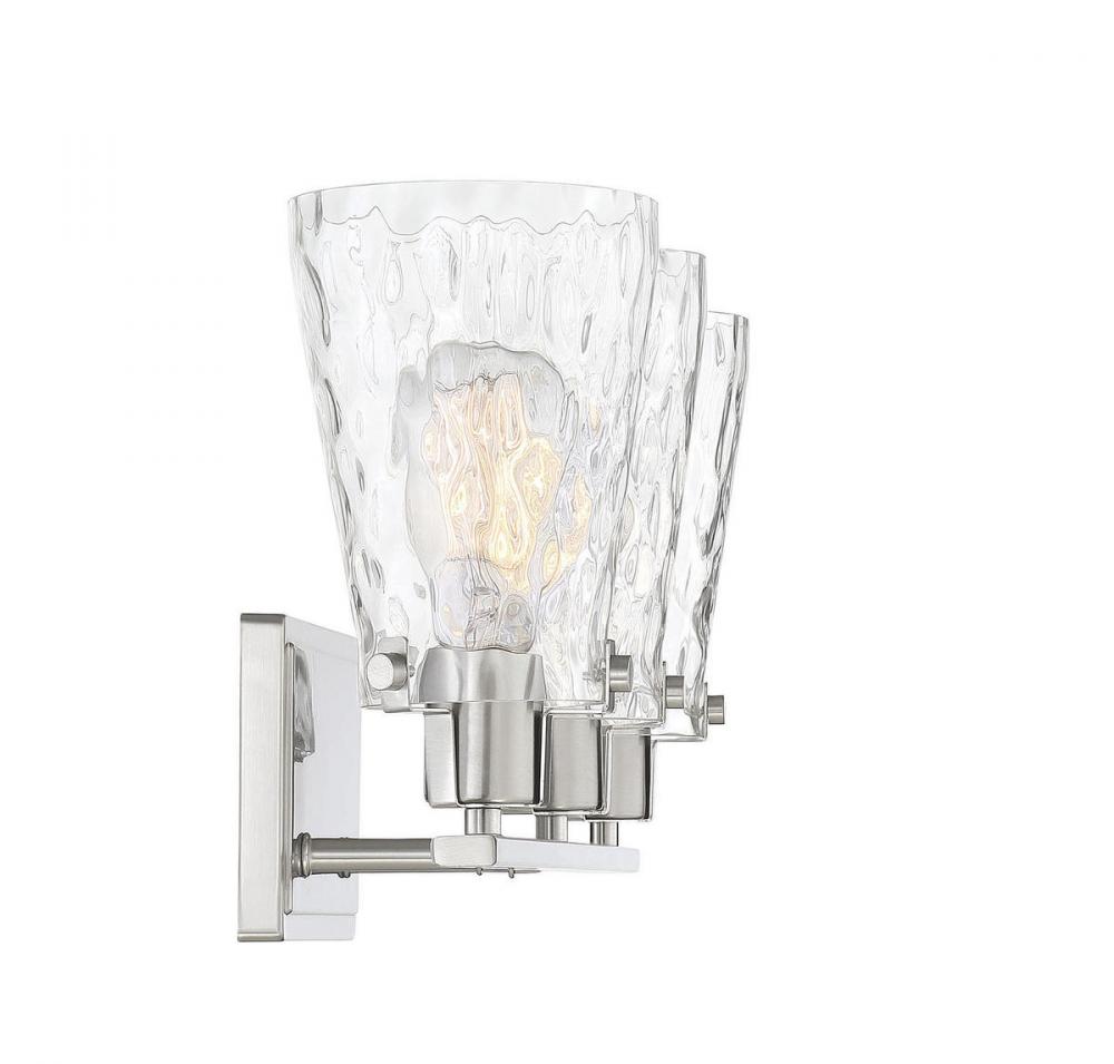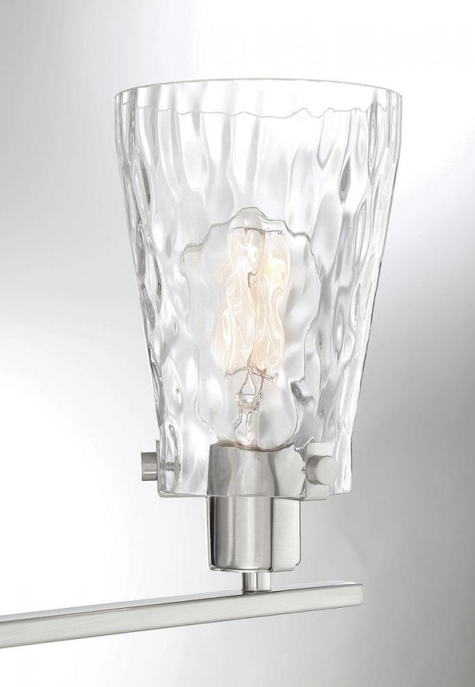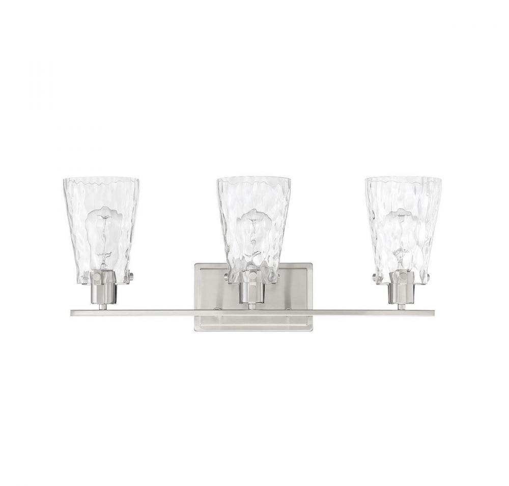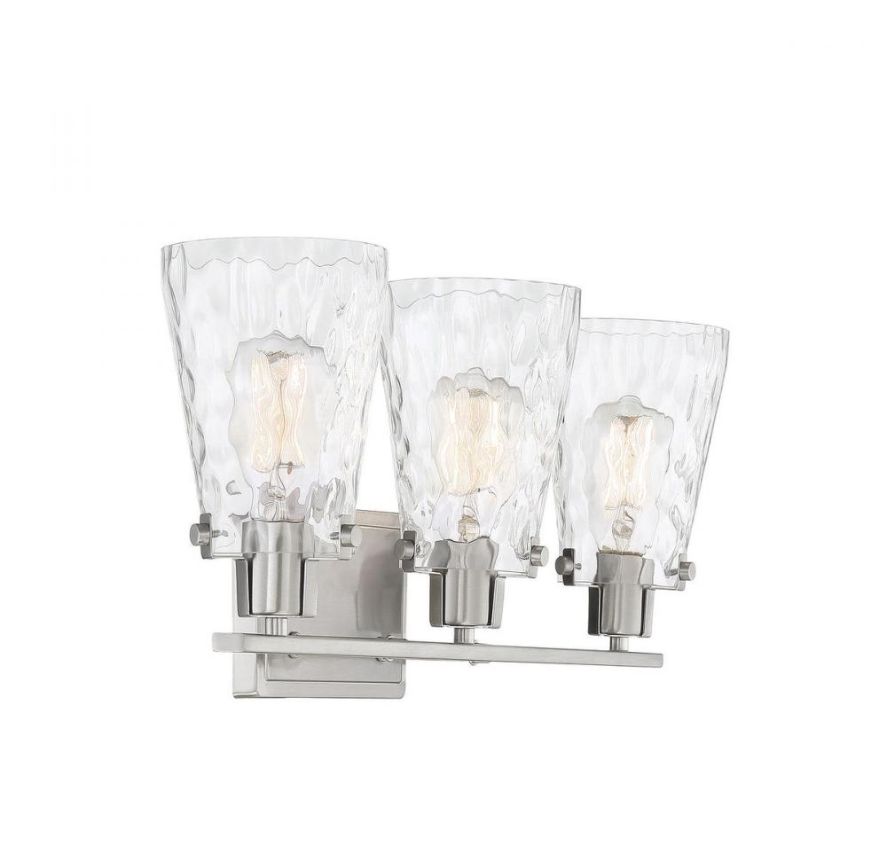 If you want a fresh, elegant lighting look in your bathroom, the Savoy House Vaughan 3-light bath bar is the perfect choice. Its sleek design showcases tall fluted shades of clear water glass that are held snugly in place with clasps and screws. The satin nickel finish works beautifully with many different colors of bathroom furnishings and hardware. This fixture is 23.75" wide and 9.25" tall. It extends 6" from the wall. Uses 3 standard size bulbs of up to 60 watts each (not included).