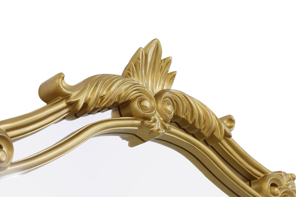 With its ornate crest and intricate corner embellishments, this mirror transforms any space into a masterpiece of classic décor