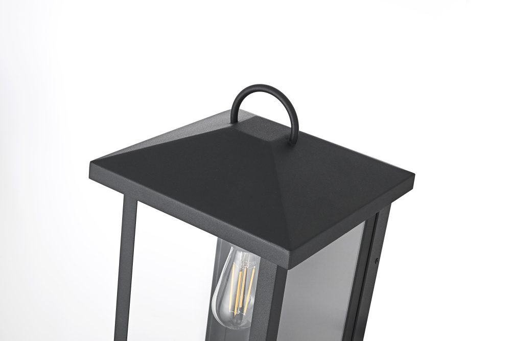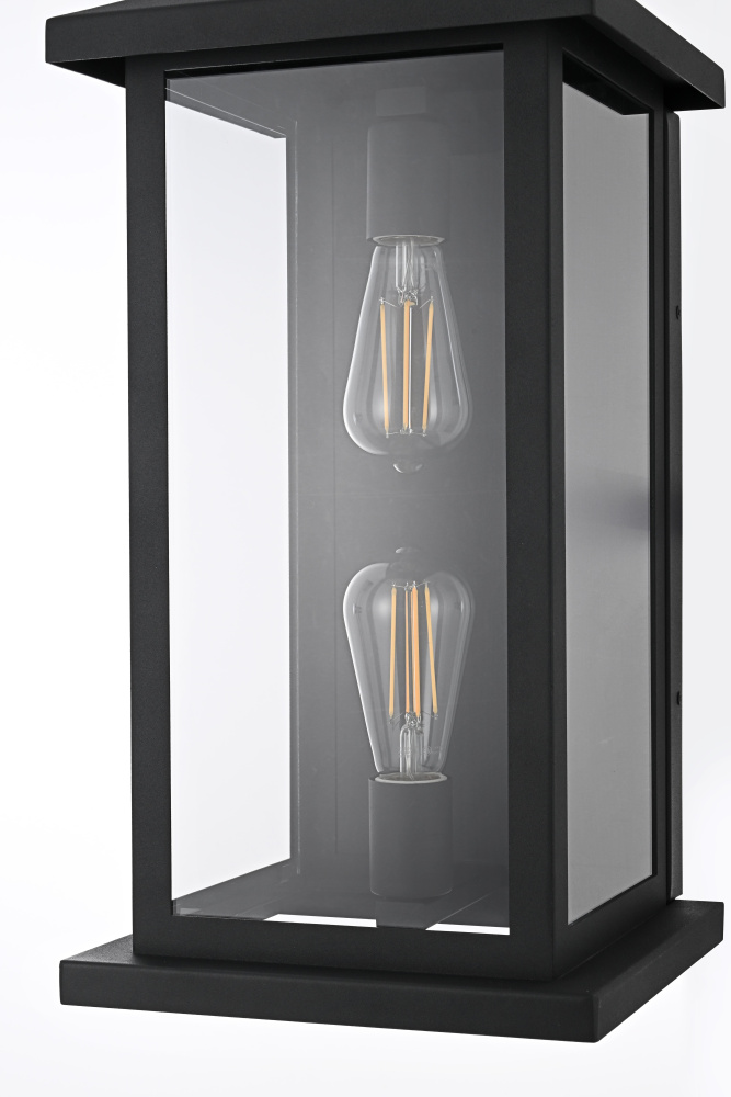 Enhance your outdoor space with the charm and functionality of this modern lantern-style wall light. A strong iron frame, finished in bold matte black, creates a timeless architectural presence, while clear glass panels allow the bulb’s warm glow to shine through unobstructed. A decorative ring detail at the top adds a subtle nod to classic lantern designs, blending tradition with modern refinement. The open-bottom design ensures easy bulb changes and effortless maintenance, making it as practical as it is stylish. Designed with two E26 sockets (bulb not included), this light allows for complete customization in brightness and style. Wet rated for durability, it’s the perfect lighting solution for front porches, patios, and outdoor walkways, offering a radiant, welcoming ambiance year-ro