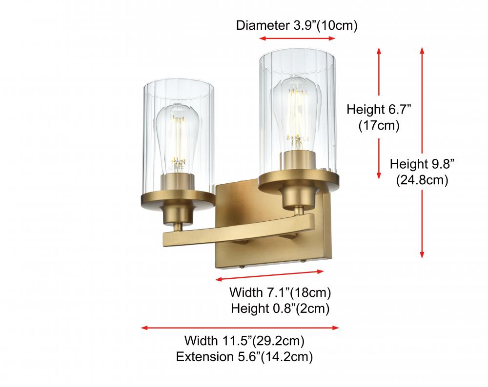 Wall sconce W11.5"x E5.6" x H9.8"L2 Satin Gold frame with Clear glass