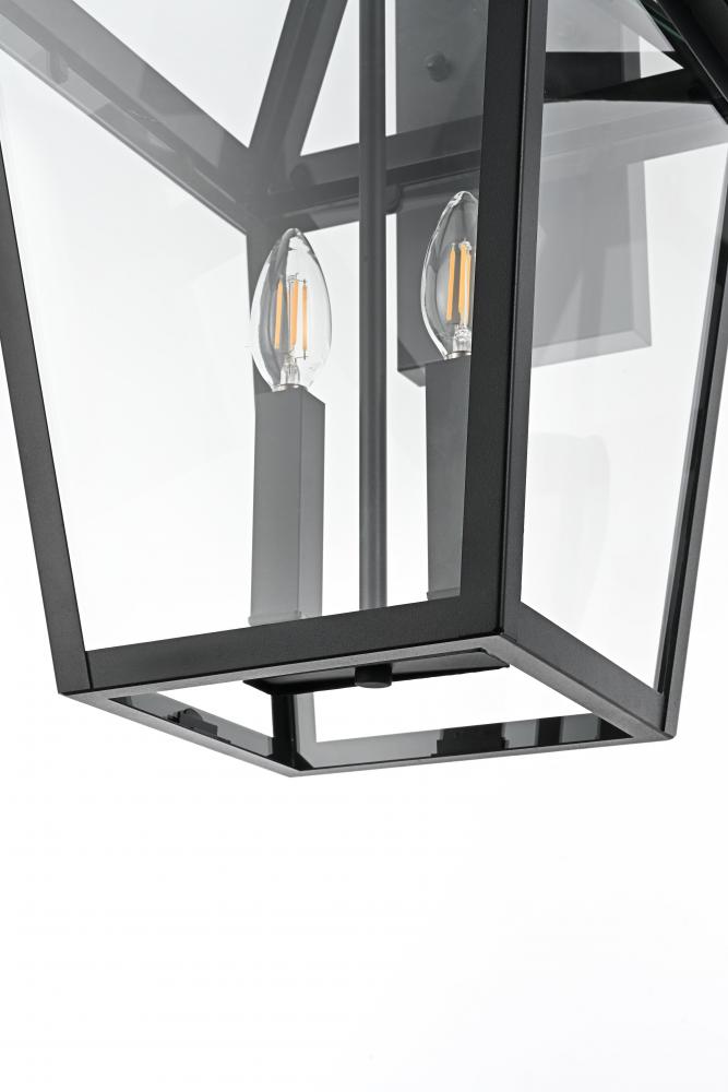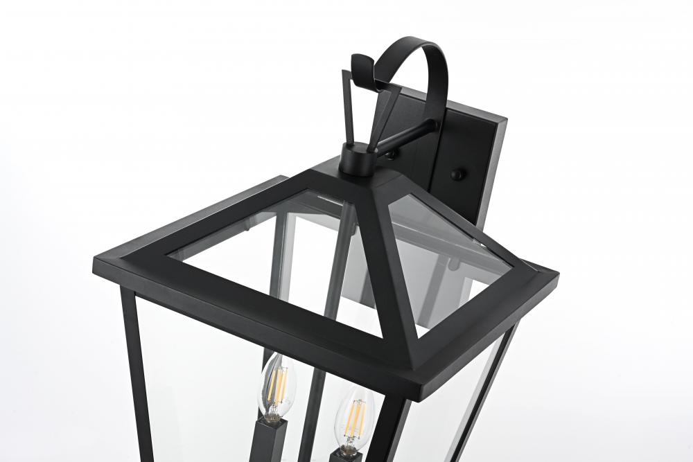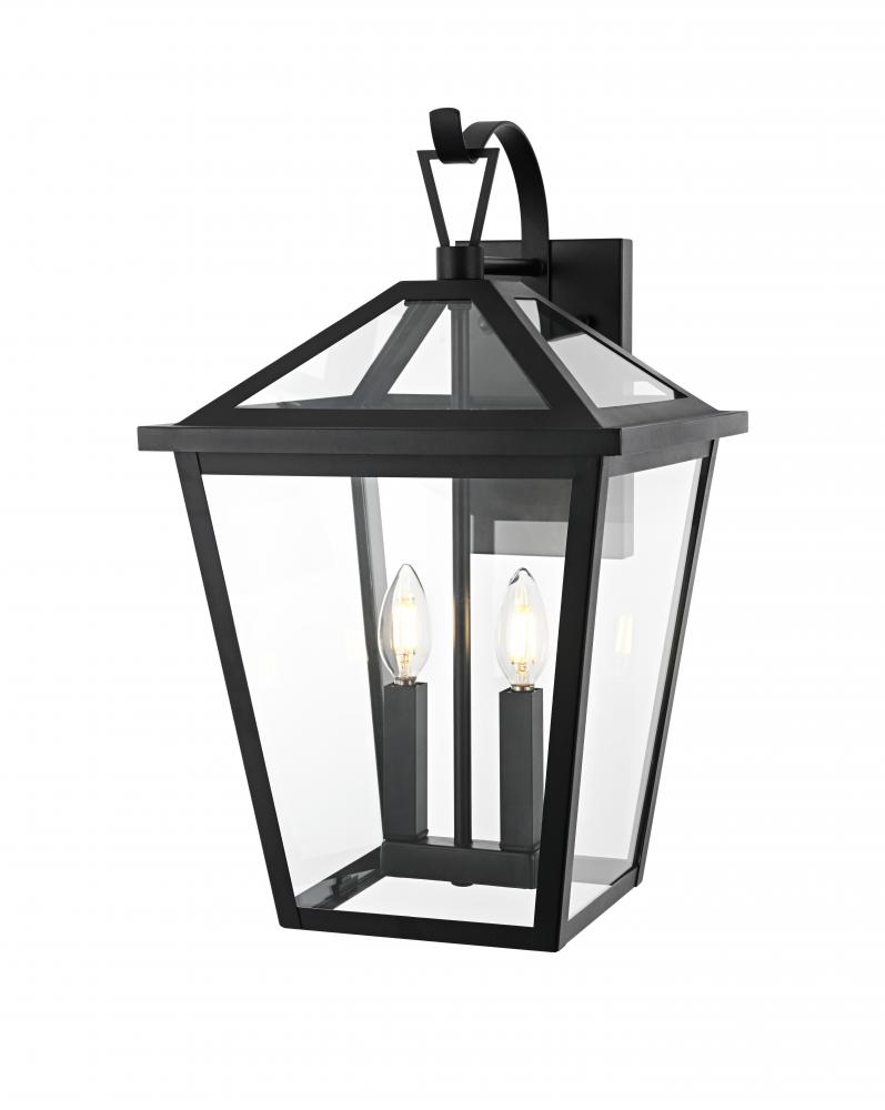 This outdoor wall sconce is a beautiful embodiment of modern and classic design that perfectly complements any exterior home setting. Constructed from sturdy iron and clear glass, the sconce combines sharp architectural lines with a timeless lantern style, resulting in a statement fixture that enhances curb appeal. The angular matte black frame, topped by a stylish triangular loop, embraces an open, trapezoid-shaped structure with clear glass panels that reveal two E12 candelabra sockets. These sockets provide the ideal opportunity to incorporate flame-shaped bulbs for a warm, welcoming ambiance. The open bottom design not only adds a touch of convenience for bulb replacement but also emphasizes the light's natural downward glow, making this sconce both practical and visually captivating. This piece is perfect for flanking a front door, lining a pathway, or accentuating any outdoor living area.