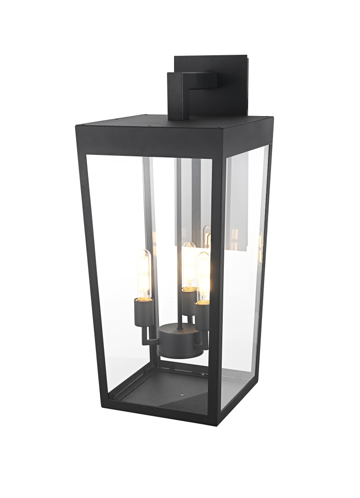 Elevate your outdoor lighting with this sleek, modern wall fixture, designed with a refined tapered silhouette and clear glass panels for an airy, sophisticated look. Constructed from durable iron with a floating mount detail, this fixture blends architectural precision with minimalist appeal. The enclosed bottom, secured with a metal plate, adds structural integrity while maintaining a streamlined, finished design. Featuring three standard E26 socket (bulb not included), this light allows for customization in brightness and style. Wet rated for durability against outdoor elements, it is perfect for entryways, patios, and exterior walls. The matte black finish enhances its bold frame, making it a striking statement piece that seamlessly balances form and function.