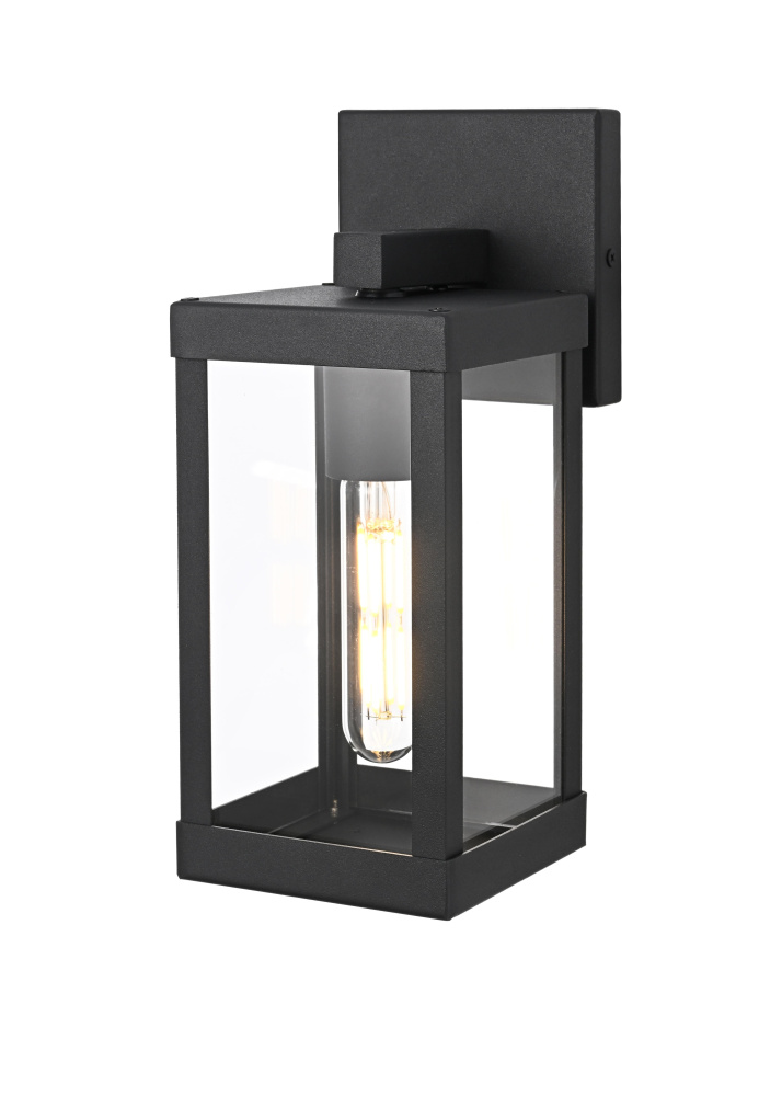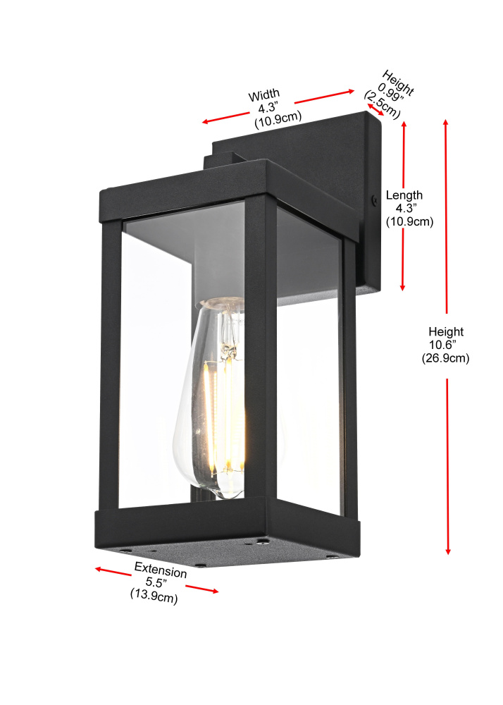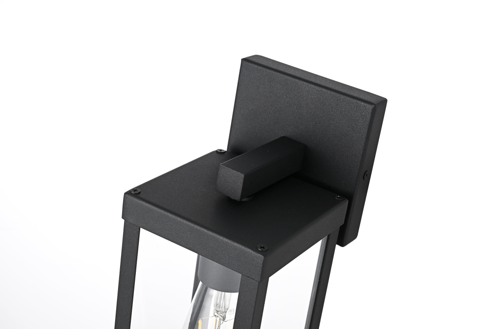 Bring definition and clarity to outdoor spaces with a modern lantern that makes a statement. A crisp rectangular frame, crafted from durable iron with a matte black finish, offers a bold contrast to the clear glass panels that surround the bulb. The structured design features an enclosed bottom for a clean and finished look, while the suspended bulb effect creates a striking focal point. A minimalist backplate and streamlined mounting arm maintain the sleek aesthetic, making this wet-rated wall light perfect for patios, entryways, and garages. Designed with an E26 socket (bulb not included), this lantern provides customizable lighting to enhance any exterior with precision and style.