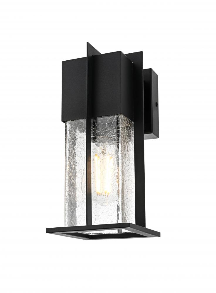 Enhance the ambiance of your outdoor space with this distinctive wall sconce, crafted from durable iron and encased in clear, crackled glass panels. Its bold, geometric frame seamlessly combines modern lines with industrial touches, making it the perfect accent for any entryway, patio, or garden. The cracked glass effect adds visual intrigue and soft diffusion of light, creating a welcoming atmosphere. Featuring an E26 socket, it provides versatility for any standard bulb, while the sturdy construction ensures longevity against weather elements. This wall sconce not only lights up the night but also serves as an architectural statement, perfect for both modern and transitional exterior designs.