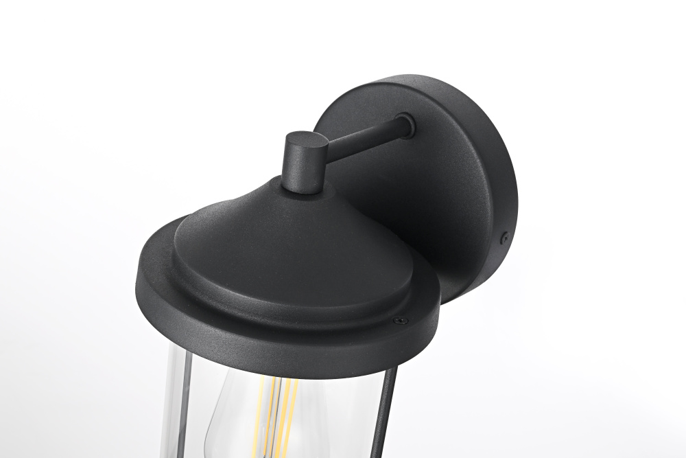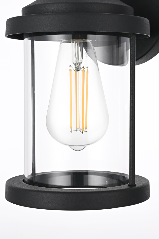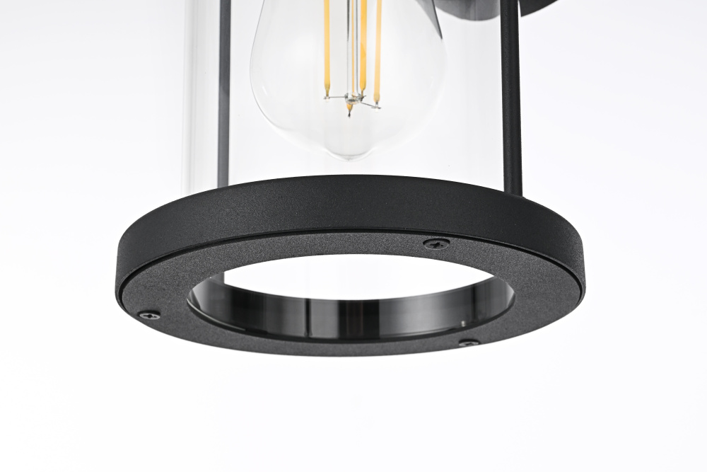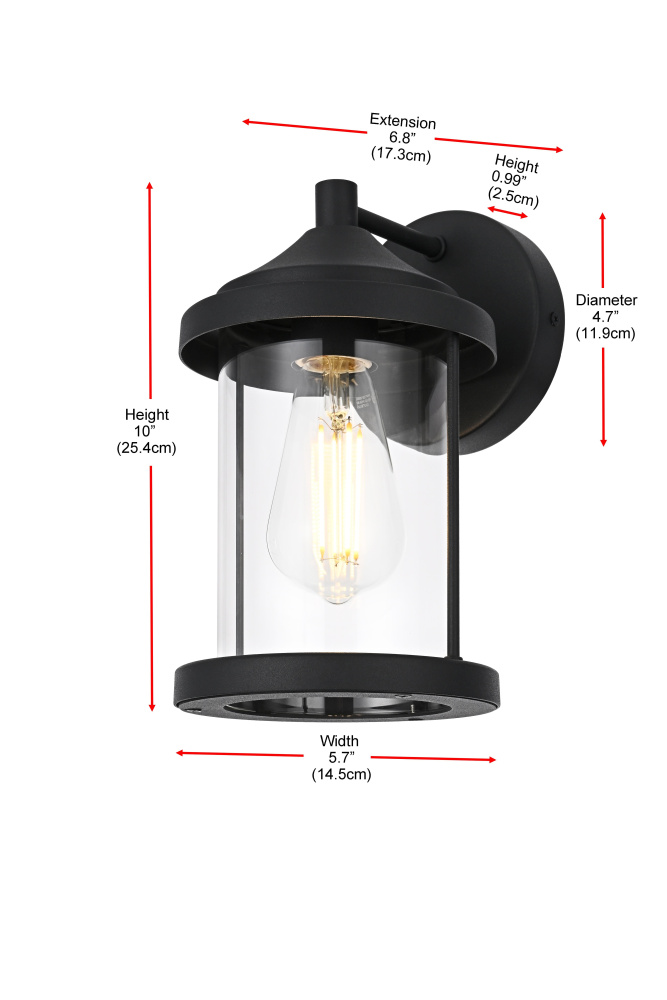 Add a touch of classic charm to your outdoor spaces with this timeless lantern-style wall light. Crafted from durable iron with a sleek circular backplate, this fixture combines traditional aesthetics with modern functionality. The clear glass cylinder provides unobstructed light, allowing the bulb to shine brilliantly, while the thick top and bottom trims frame the design with balance and structure. The open-bottom design not only enhances its aesthetic appeal but also ensures easy bulb replacement. Wet rated for outdoor durability, this light is perfect for porches, patios, and entryways. Featuring an E26 socket, it allows you to customize the look with your choice of bulb (not included). Bring style and practicality to your home’s exterior with this refined and versatile lighting fixtur