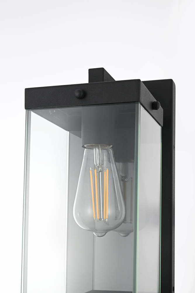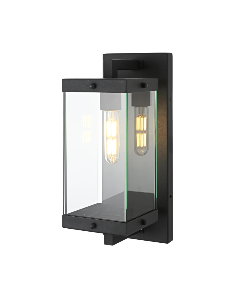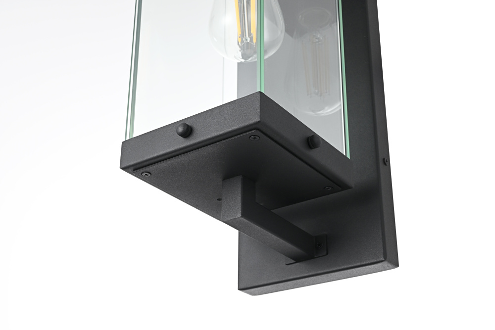 Elevate your outdoor lighting with this refined modern box lantern, designed for both style and durability. Crafted from high-quality iron with a sleek matte black finish, this fixture features a clean-lined rectangular frame accented by clear glass panels for maximum illumination. The enclosed bottom, secured with screws, enhances the structure’s durability while protecting the bulb from direct exposure. A floating arm mount adds a touch of architectural elegance, making this fixture an eye-catching addition to any exterior. Designed with an E26 socket (bulb not included), it offers versatility in lighting choices to suit your space. Wet rated for outdoor resilience, this fixture is perfect for patios, entryways, and exterior walls, blending contemporary aesthetics with functional brillianc