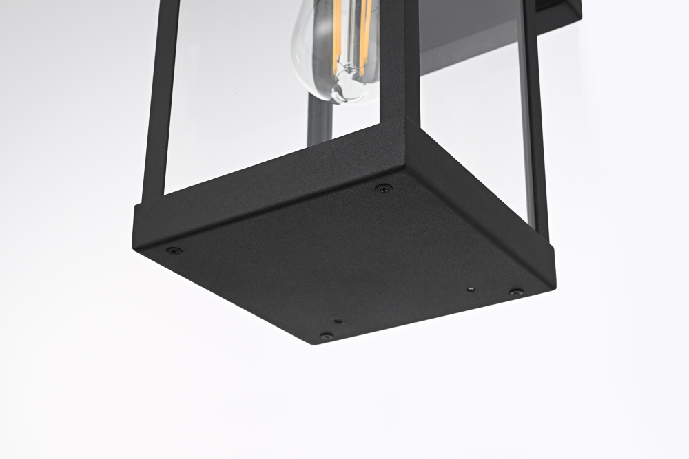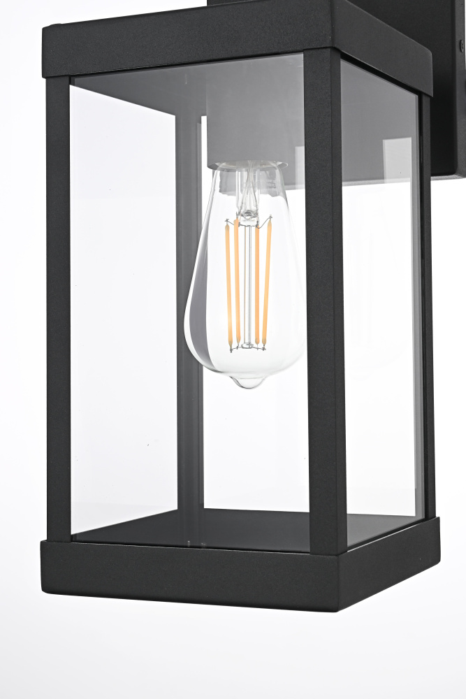 Bring definition and clarity to outdoor spaces with a modern lantern that makes a statement. A crisp rectangular frame, crafted from durable iron with a matte black finish, offers a bold contrast to the clear glass panels that surround the bulb. The structured design features an enclosed bottom for a clean and finished look, while the suspended bulb effect creates a striking focal point. A minimalist backplate and streamlined mounting arm maintain the sleek aesthetic, making this wet-rated wall light perfect for patios, entryways, and garages. Designed with an E26 socket (bulb not included), this lantern provides customizable lighting to enhance any exterior with precision and style.