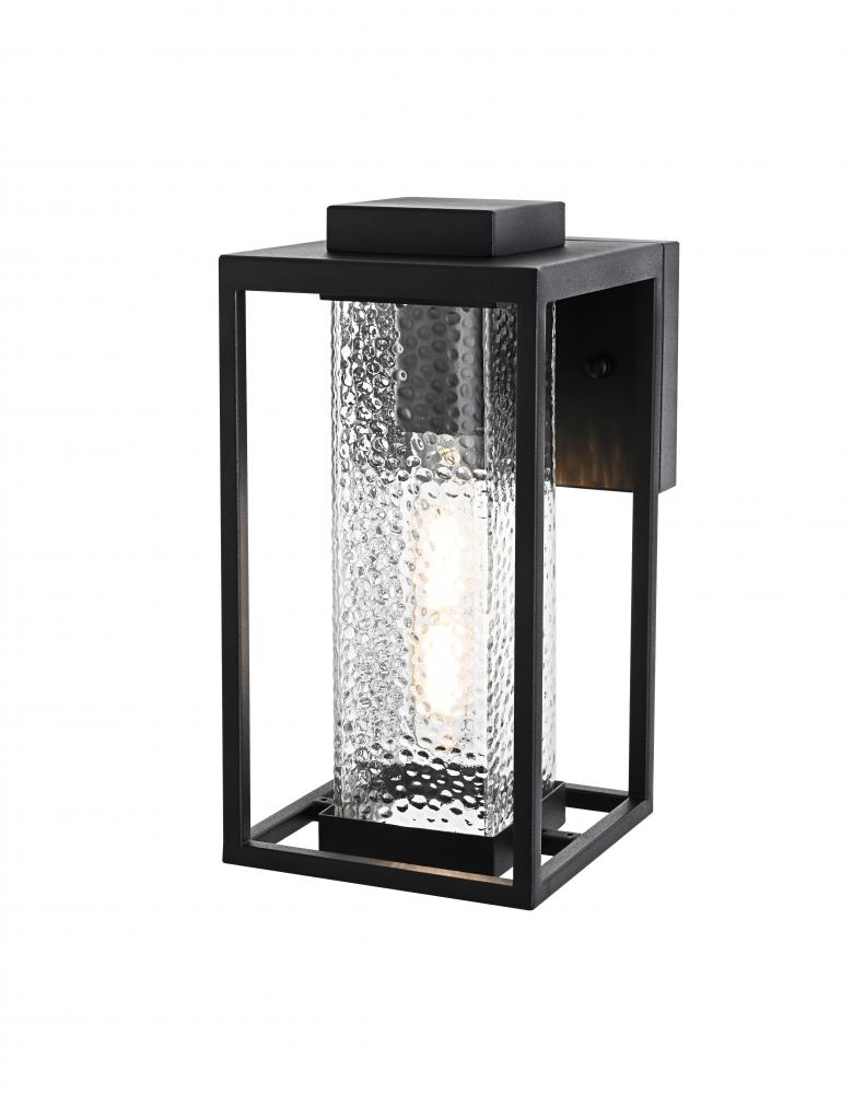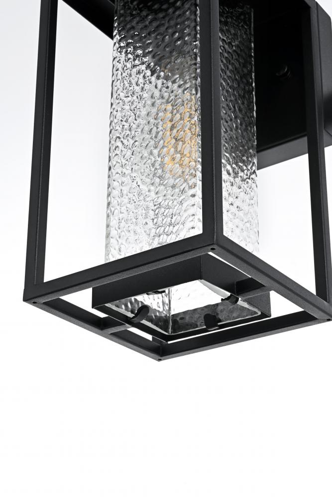 This outdoor wall sconce combines durability with a touch of character, perfectly suited to elevate your exterior space. The iron frame adds strength and durability, while the hammered glass creates a beautiful, diffused lighting effect, enhancing the warm glow of the bulb. The sharp angles and clean lines of the iron frame provide a modern touch that blends seamlessly with the rustic textures of the glass, creating a versatile look that complements a wide range of styles.