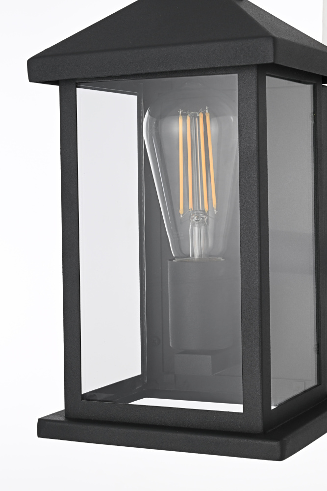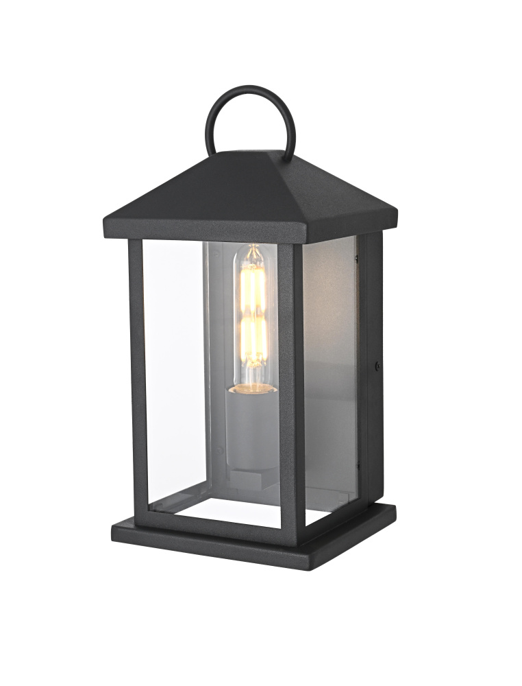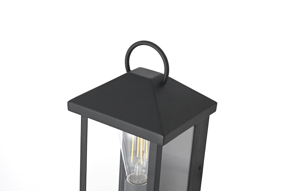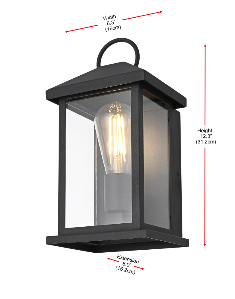 Enhance your outdoor space with the charm and functionality of this modern lantern-style wall light. A strong iron frame, finished in bold matte black, creates a timeless architectural presence, while clear glass panels allow the bulb’s warm glow to shine through unobstructed. A decorative ring detail at the top adds a subtle nod to classic lantern designs, blending tradition with modern refinement. The open-bottom design ensures easy bulb changes and effortless maintenance, making it as practical as it is stylish. Designed with an E26 socket (bulb not included), this light allows for complete customization in brightness and style. Wet rated for durability, it’s the perfect lighting solution for front porches, patios, and outdoor walkways, offering a radiant, welcoming ambiance year-ro