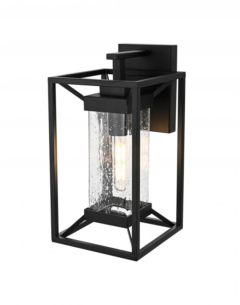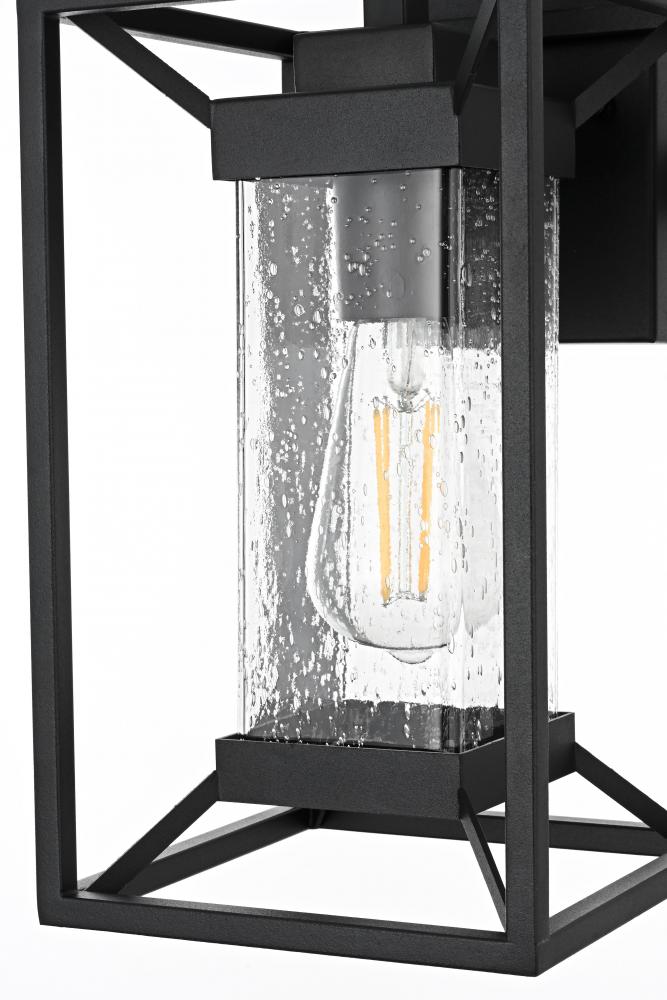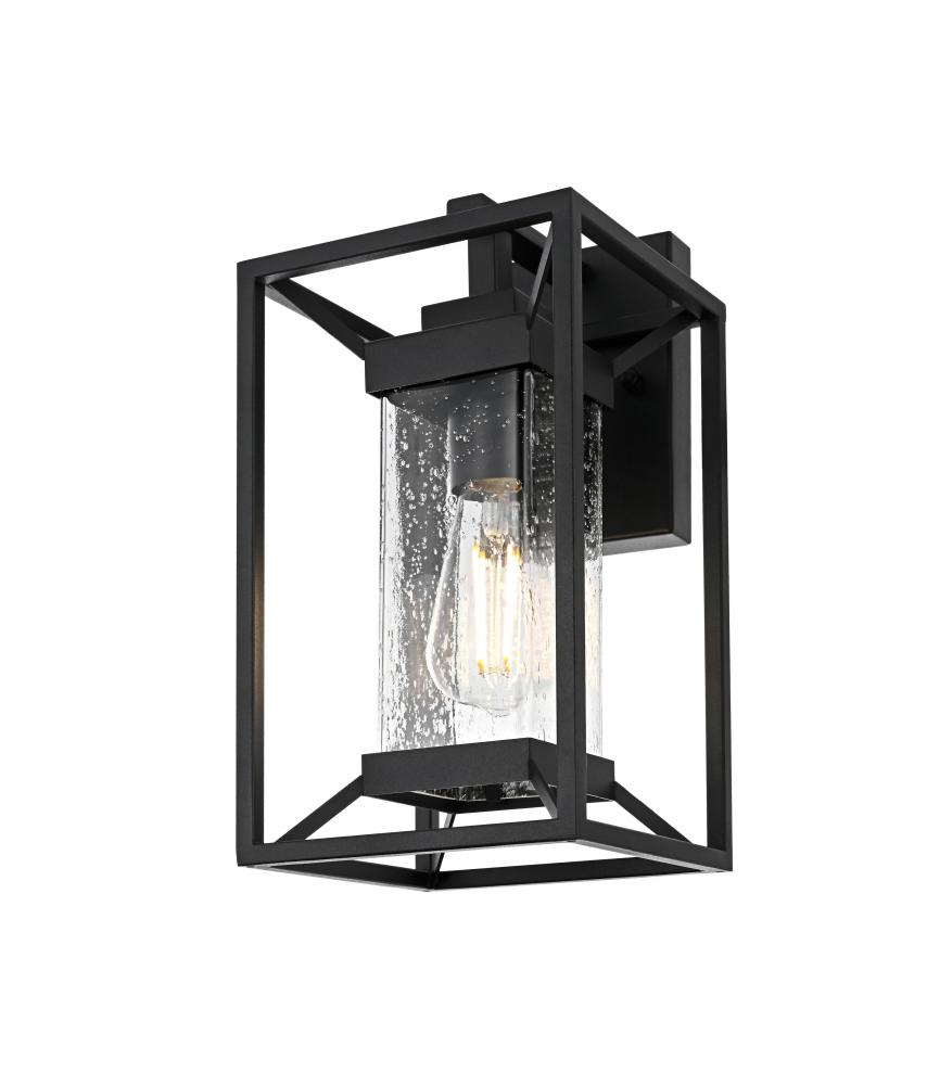 This outdoor wall sconce blends modern simplicity with timeless charm. The sturdy iron frame is designed in a geometric shape, beautifully housing the clear seeded glass that allows the warm glow of the light to shine through. The clear seeded glass adds texture to the illumination, creating an inviting and sophisticated glow that transforms the exterior of your home. with an E26 socket base that easily accommodates standard bulbs, this fixture not only provides style but also high functionality. Whether flanking your front door or lighting up your patio, this sconce elevates your outdoor space with a crisp, contemporary look that is both durable and refined.