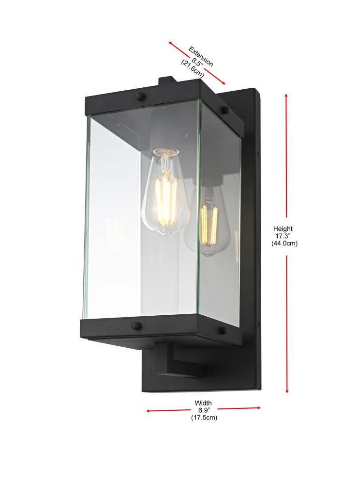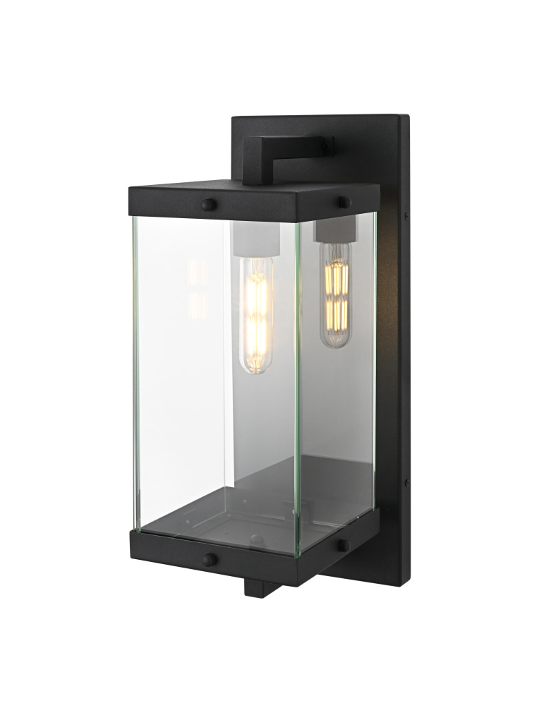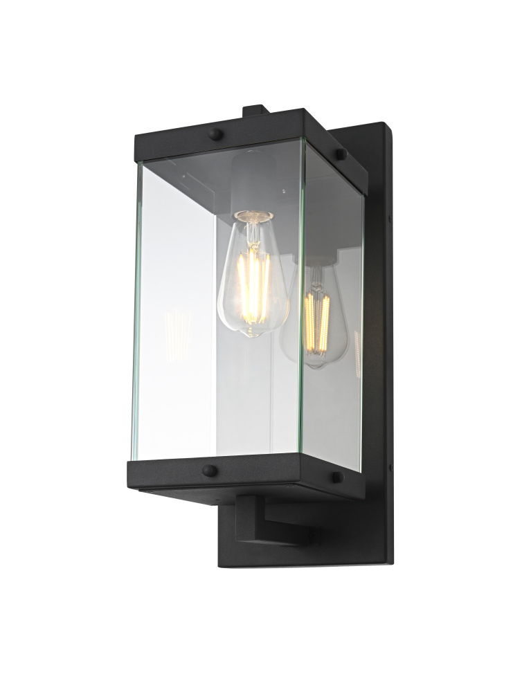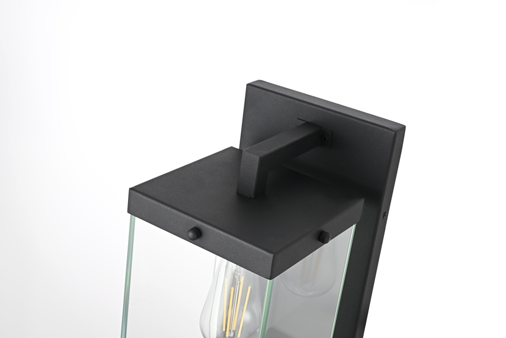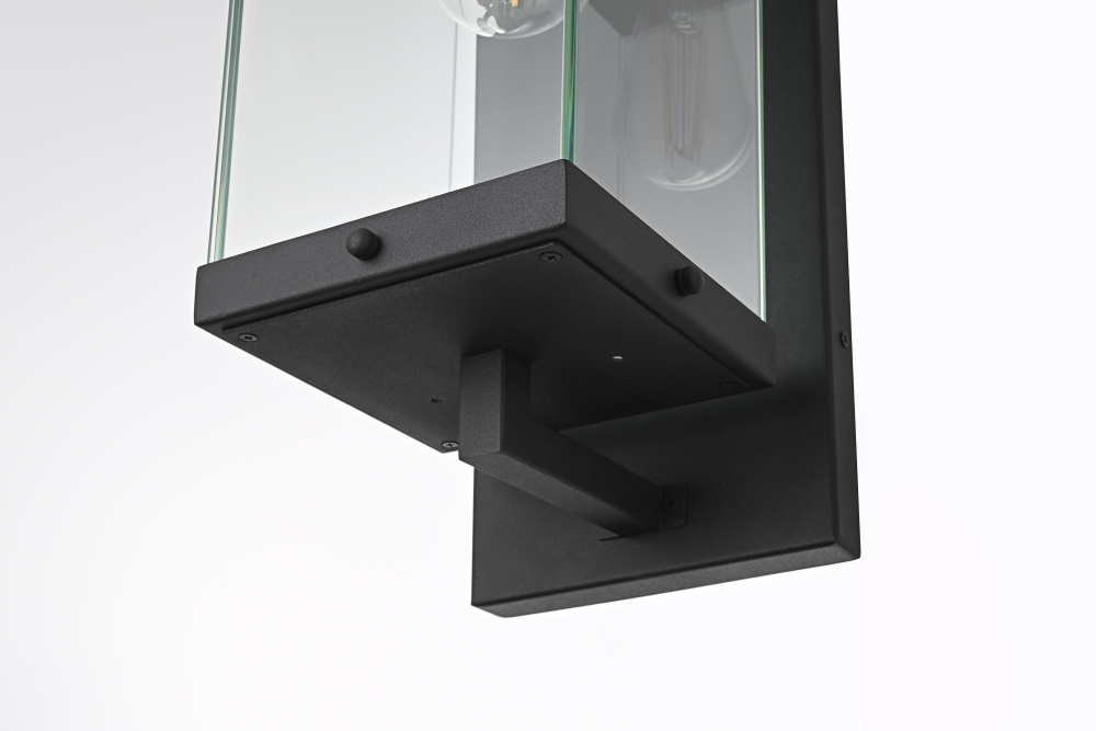 Elevate your outdoor lighting with this refined modern box lantern, designed for both style and durability. Crafted from high-quality iron with a sleek matte black finish, this fixture features a clean-lined rectangular frame accented by clear glass panels for maximum illumination. The enclosed bottom, secured with screws, enhances the structure’s durability while protecting the bulb from direct exposure. A floating arm mount adds a touch of architectural elegance, making this fixture an eye-catching addition to any exterior. Designed with an E26 socket (bulb not included), it offers versatility in lighting choices to suit your space. Wet rated for outdoor resilience, this fixture is perfect for patios, entryways, and exterior walls, blending contemporary aesthetics with functional brillianc