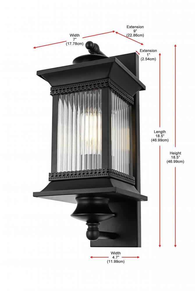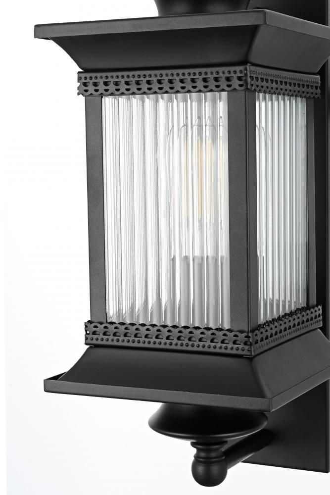 Enhance your home's exterior with this thoughtfully designed outdoor wall sconce that combines timeless character with modern functionality. The wall sconce features a robust iron construction that offers both durability and a bold architectural presence, making it a charming addition to your entryway or patio. Its signature black finish contrasts beautifully with the intricate ribbed glass panels, which cast enchanting, diffused illumination that adds a touch of warmth to any evening. The decorative accents along the trim exude a sense of sophistication, while the robust shape lends itself to a versatile range of outdoor styles—from classic to contemporary. This wall sconce serves as both a functional light source and a statement piece that complements your outdoor space with unique artistry.
