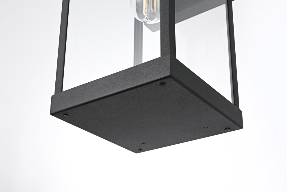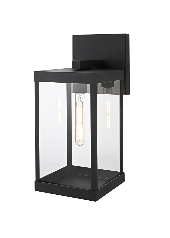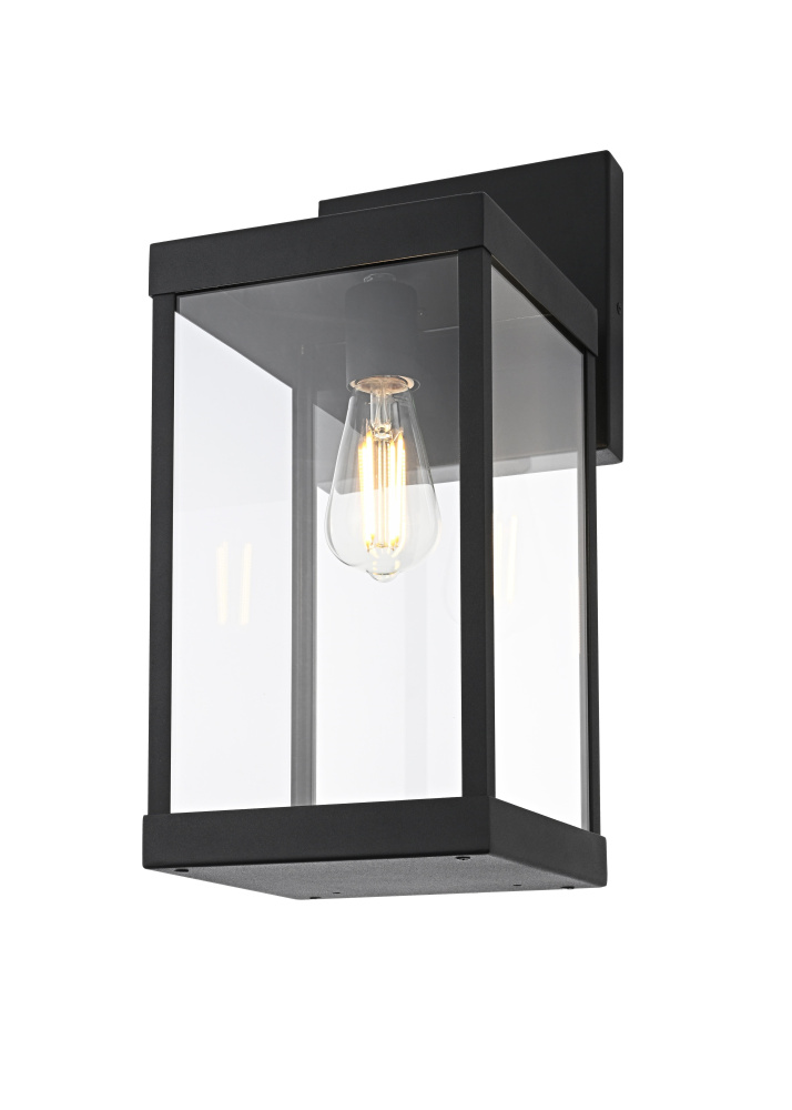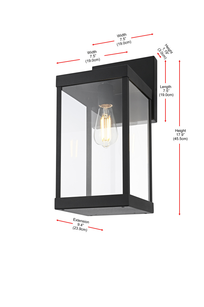 Bring definition and clarity to outdoor spaces with a modern lantern that makes a statement. A crisp rectangular frame, crafted from durable iron with a matte black finish, offers a bold contrast to the clear glass panels that surround the bulb. The structured design features an enclosed bottom for a clean and finished look, while the suspended bulb effect creates a striking focal point. A minimalist backplate and streamlined mounting arm maintain the sleek aesthetic, making this wet-rated wall light perfect for patios, entryways, and garages. Designed with an E26 socket (bulb not included), this lantern provides customizable lighting to enhance any exterior with precision and style.
