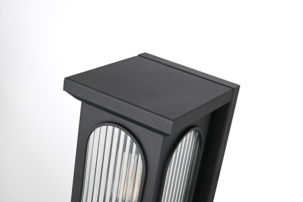 Make a bold statement with an outdoor wall light that combines structured lines with rich texture. A sturdy rectangular frame, finished in deep matte black, surrounds striking clear fluted glass panels that create a glowing, rippled effect when illuminated. The curved oval inserts soften the geometric shape, offering a balanced mix of bold structure and subtle detailing. With an enclosed bottom for a refined finish, this wet-rated wall light is built to endure outdoor conditions while maintaining its standout appeal. Designed with an E26 socket (bulb not included), it pairs effortlessly with vintage Edison bulbs for a warm glow or LED options for energy efficiency. Whether framing a front door, lighting up a patio, or brightening a side entry, this standout piece blends texture and form for a captivating outdoor look.