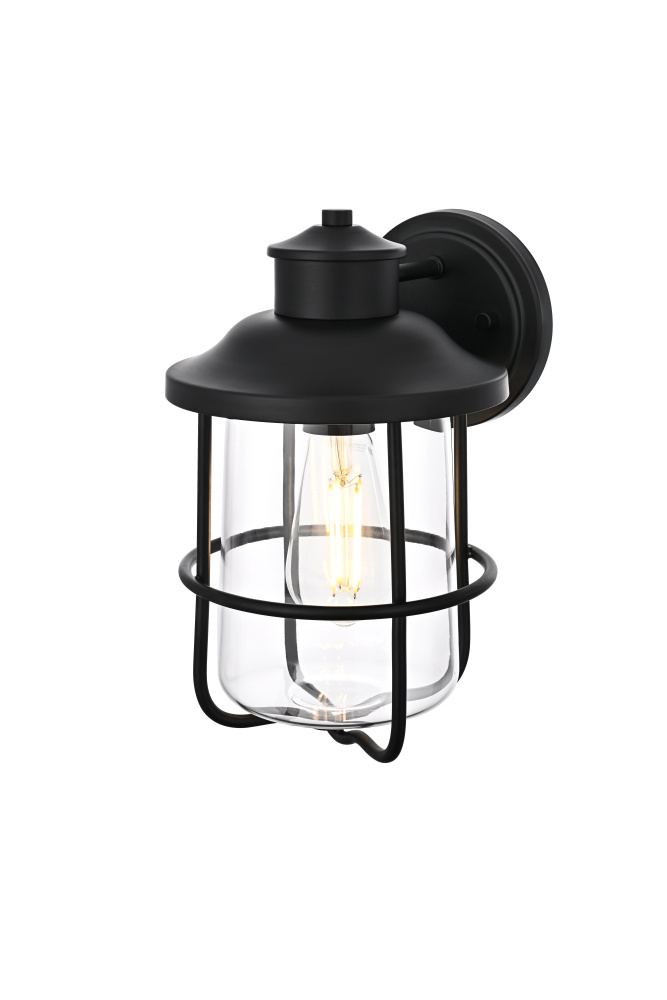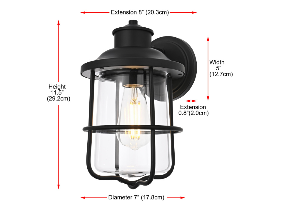 Enhance outdoor spaces with a wall light that blends industrial strength with vintage-inspired charm. A sturdy metal frame, finished in matte black, surrounds a clear glass enclosure, allowing bright, unobstructed illumination for porches, entryways, and garages. A protective cage adds durability while reinforcing the lantern’s rugged aesthetic, making it a stylish yet practical choice for exterior lighting. The rounded cap with subtle tiered detailing softens the overall look, offering a refined touch to its structured form. Designed with an E26 socket (bulb not included), this wet-rated wall light withstands the elements while delivering a timeless glow. Whether paired with an Edison bulb for vintage appeal or a bright LED for energy efficiency, this outdoor sconce offers both striking design and functional performanc