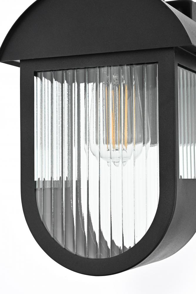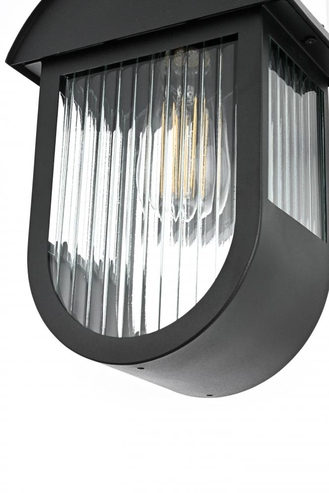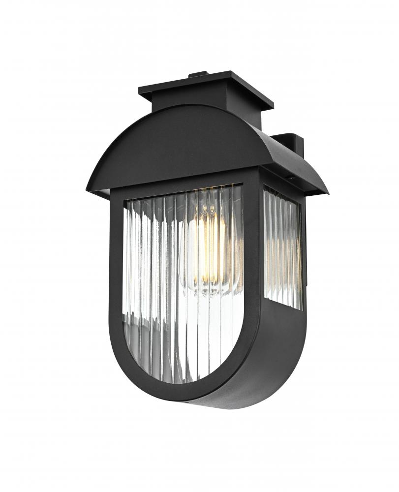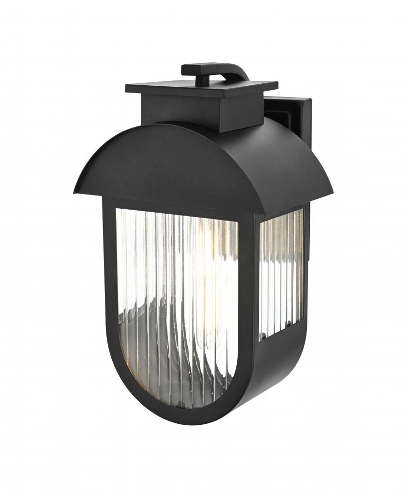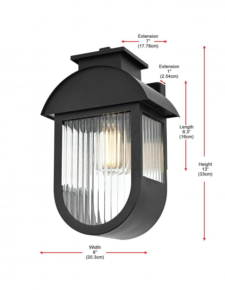 This outdoor wall sconce brings a bold blend of style and functionality to any space. The combination of iron and ribbed glass offers an eye-catching juxtaposition of smooth, industrial material with light-diffusing texture. The matte black finish and arching cover create a modern silhouette, which pairs well with a wide range of exteriors. The E26 socket further adds versatility, accommodating a variety of bulb types, allowing you to customize the mood of your space. This sconce's clean lines and sturdy build make it a sophisticated addition to patios, porches, and entryways, enhancing both safety and curb appeal.