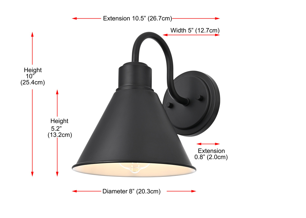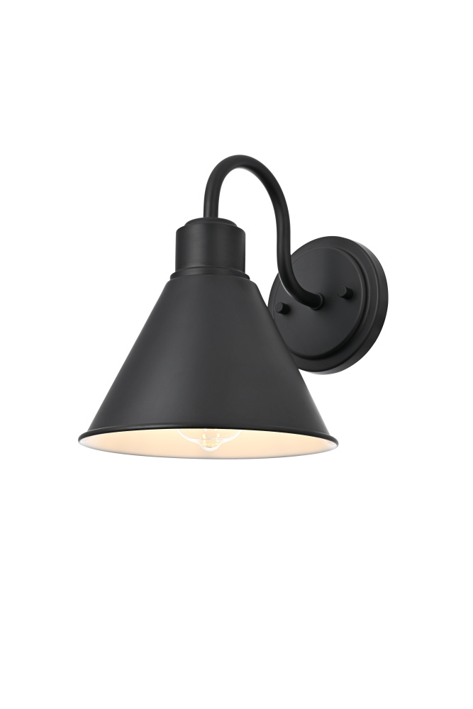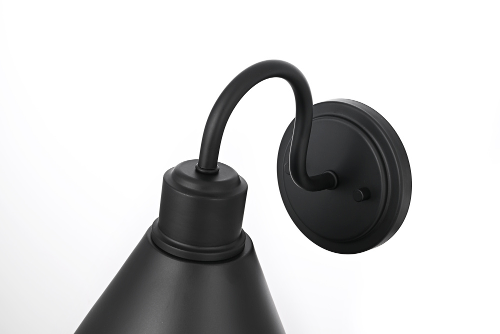 Bring a striking, modern touch to outdoor spaces with a conical gooseneck wall light that blends industrial inspiration with sleek design. A sharply defined matte black metal shade directs light downward for functional illumination, while the crisp white interior enhances brightness for a well-lit entryway or patio. The smoothly curved gooseneck arm extends gracefully from the circular backplate, creating a balanced look that stands out against exterior walls. With an E26 socket (bulb not included), this wet-rated wall light is built for outdoor durability, making it an ideal choice for garages, porches, and storefronts. Whether styled with a warm Edison bulb for a vintage feel or an LED for modern efficiency, this statement piece adds both style and practicality to any outdoor setting.