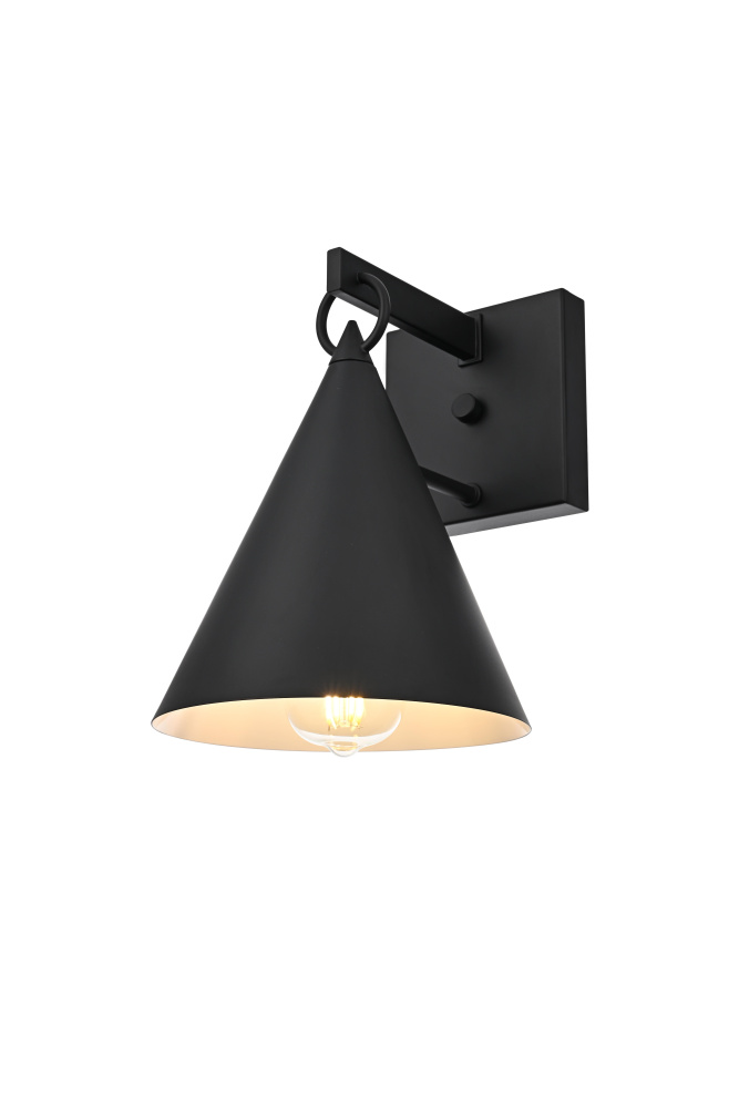 Transform any outdoor space with a statement wall light that blends sharp geometry with sleek modern appeal. A bold conical metal shade, finished in matte black, directs light downward for focused illumination, while the crisp white interior enhances brightness for a well-lit entryway or patio. A decorative ring detail adds a unique touch, softening the structured design and providing an artistic element. Supported by a sturdy squared backplate, this striking outdoor sconce maintains a strong architectural presence. The open-bottom shade ensures bright, practical lighting while making bulb replacements effortless. Designed with an E26 socket (bulb not included), this wet-rated fixture is built for durability, making it a stylish yet functional choice for porches, storefronts, and garage exteriors. Whether paired with an Edison bulb for a warm glow or a bright LED for crisp illumination, this standout piece elevates any outdoor setting with its sharp, modern aesthetic.