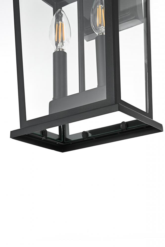 Enhance your outdoor space with this stylish wall sconce that features a striking matte black frame paired with clear glass panels, perfectly showcasing its modern charm. The latern box shape is adorned with a distinctive triangular loop on top, adding a unique architectural touch that seamlessly combines functionality with a bold, sleek aesthetic. The open bottom design allows for easy bulb changes and casts a beautiful downward light, adding a welcoming glow to your entrance or patio area. Crafted from durable iron with a clean, modern style, this wall sconce is perfect for those who appreciate a blend of simplicity and contemporary design. The clear glass ensures maximum light output, enhancing visibility while emphasizing the beautiful shape of the bulb inside. The E12 socket offers versatility for different bulb styles, allowing you to easily customize the ambiance of your outdoor area.
