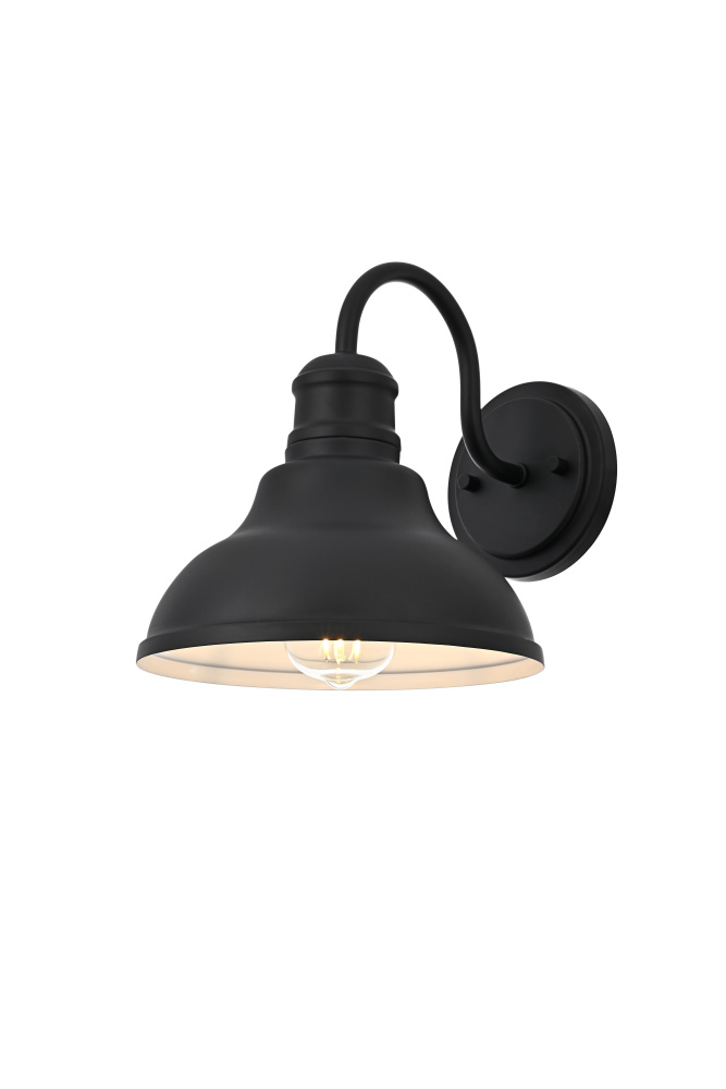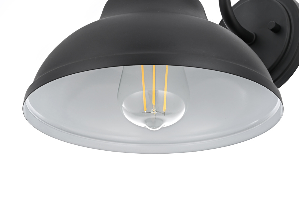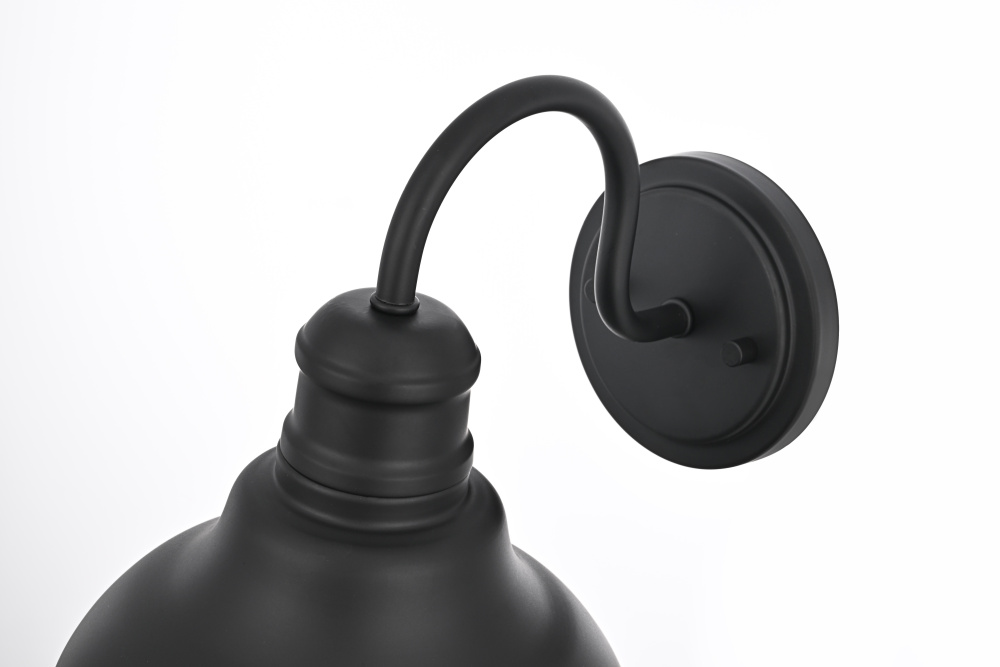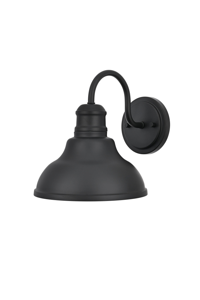Upgrade outdoor spaces with a barn-style wall light that brings industrial charm with a refined touch. A gently curved metal shade, finished in deep matte black, features tiered detailing near the neck, adding subtle dimension to its bold shape. The wide-open bottom directs light downward, while the crisp white interior maximizes brightness for clear and effective illumination. A gracefully arched gooseneck arm extends from the sturdy circular backplate, keeping the design well-balanced and visually striking. Designed with an E26 socket (bulb not included), this wet-rated wall light is built to withstand the elements, making it an ideal choice for patios, garage doors, and entryways. Whether styled with a warm Edison bulb for vintage appeal or a bright LED for modern efficiency, this statement-making outdoor sconce delivers both function and style.