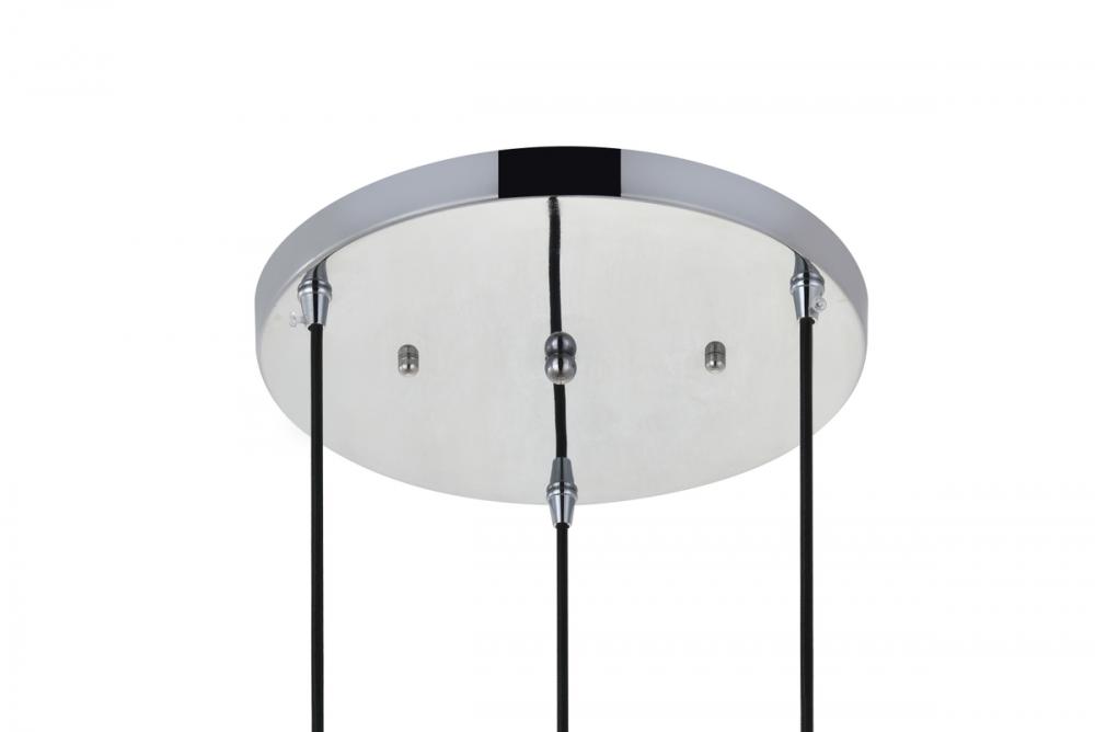 Chrome finish 3-light pendant light and short cone shaped shade hanging from a circular canopy
