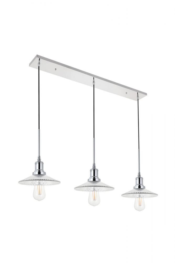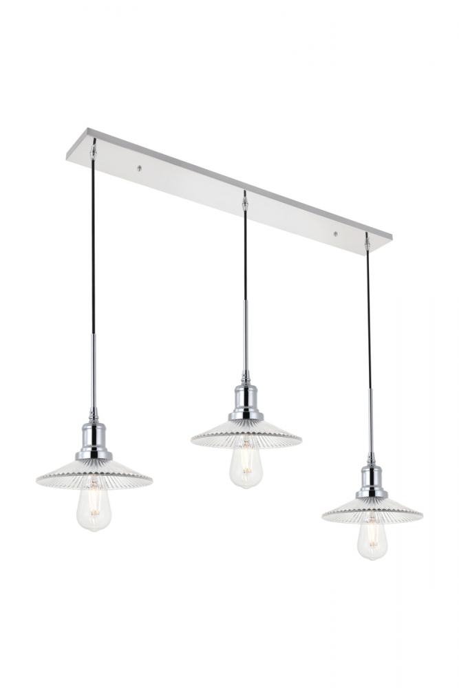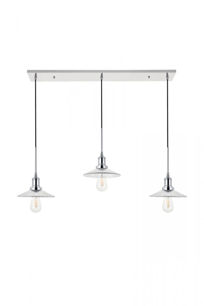 Chrome finish 3-light pendant light and short cone shaped shade hanging from a rectangular canopy