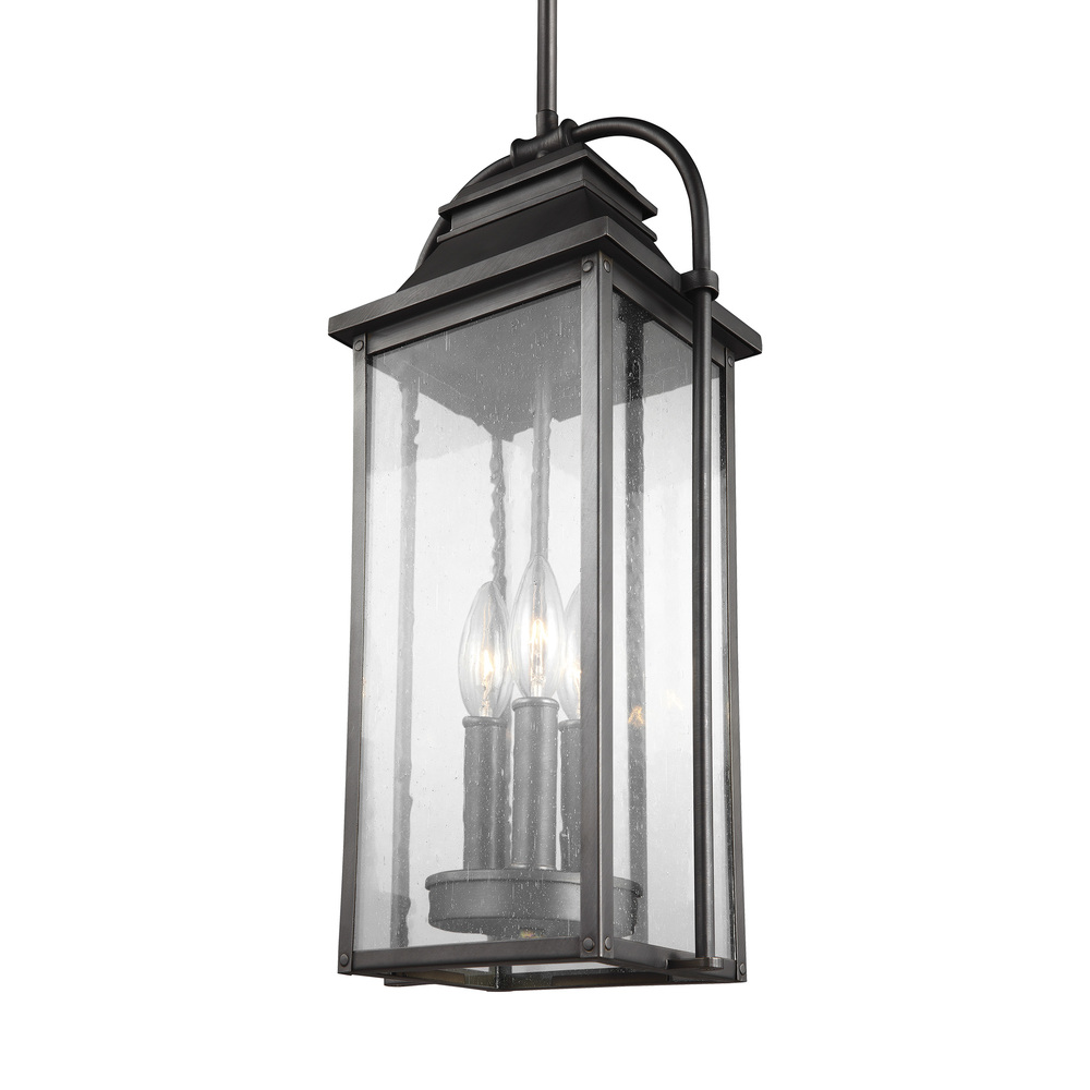 The Sean Lavin Wellsworth three light outdoor pendant fixture in antique bronze enhances the beauty of your property, makes your home safer and more secure, and increases the number of pleasurable hours you spend outdoors. A subtle interplay of traditional design elements and nautical influences creates the charming visual approach to the Wellsworth outdoor collection by Visual Comfort Studio. Available in three finishes and two different aesthetics. Antique Bronze finish paired with Clear Seeded glass creates a more traditional look to these outdoor light fixtures; while Burnished Brass and Painted Brushed Steel finish coupled with Clear glass reflects a more contemporary approach. The Wellsworth collection includes a 3-light outdoor pendant, a 3-light outdoor post lantern, and 3-light small and medium outdoor lanterns, as well as a 4-light large outdoor lantern. Cast aluminum construction ensures durability. Wet Rated.