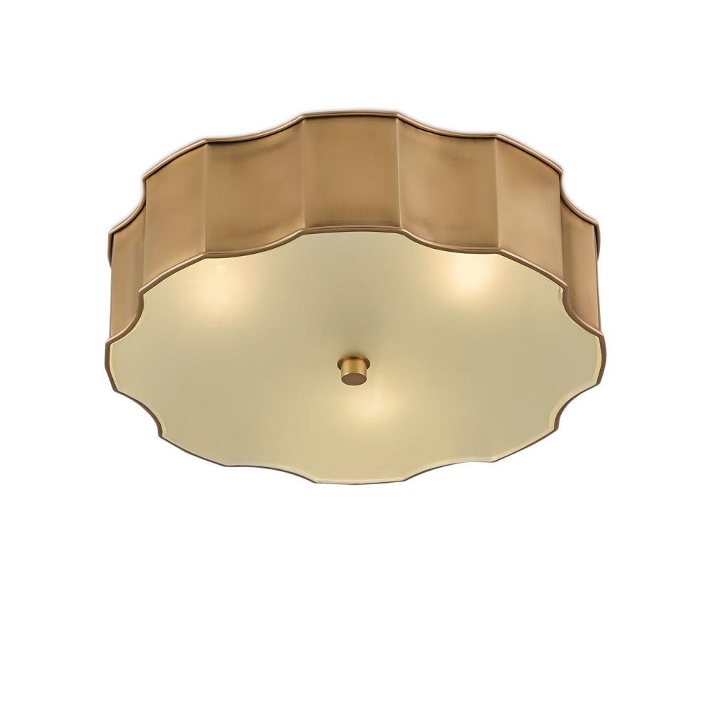 Tastefully restrained and endlessly adaptable, it's easy to see why the Wexford Flush Mount has been one of our bestsellers. The exterior ridges of this appealing three-light fixture, which are made of brass, have been treated to an antique brass finish. The warmth of the surface is a lovely complement to the soft glow produced by an opaque glass diffuser fitted with a finial in a matching antique brass.
