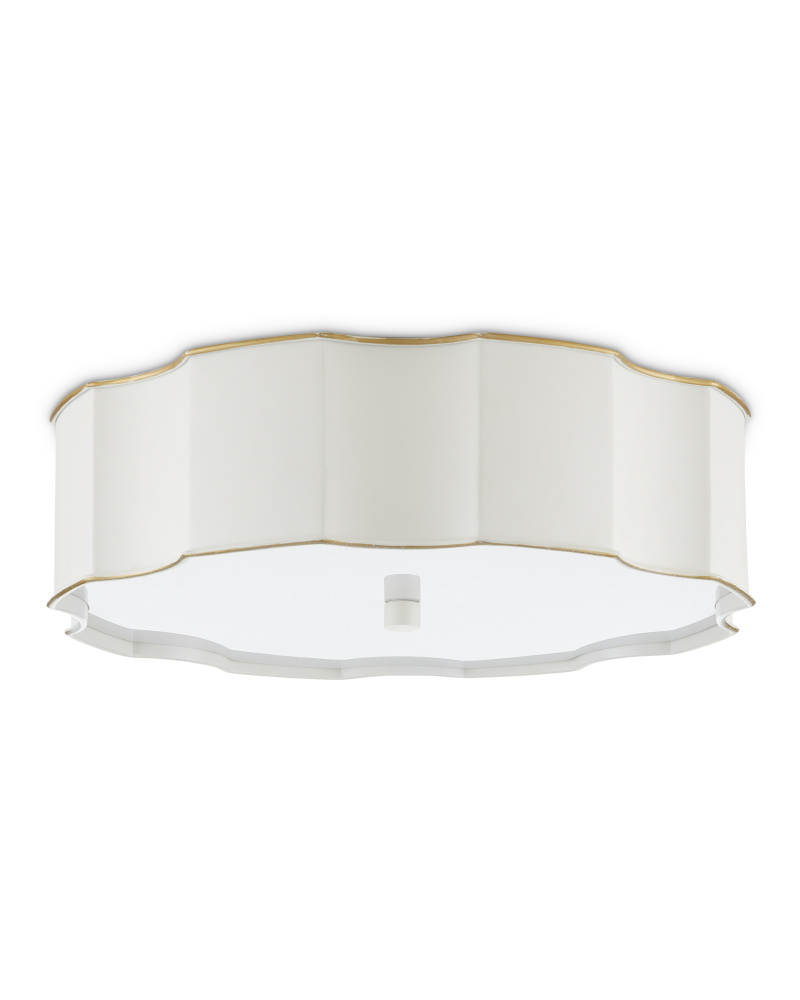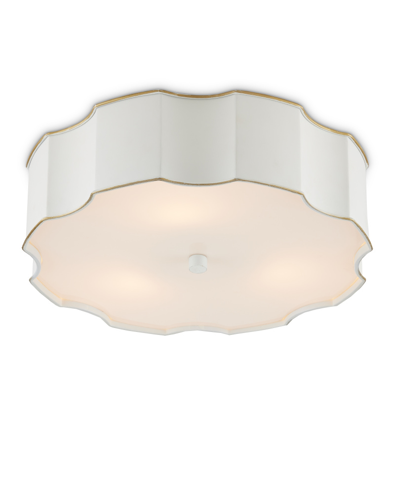 The Wexford White Flush Mount is made of metal in a snow white finish. The paleness of the surface works in concert with the soft glow produced by the opaque acrylic diffuser to create a luminous design. The matching finial that fastens the diffuser to the fixture and the scalloped shape of its profile are graceful elements.