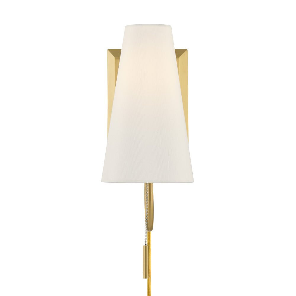 The Savoy House Wilkes 1-light sconce, designed by award-winning interior designer Dann Foley, offers versatility and elegance in one beautifully executed piece. A Warm Brass finished arm and delicate pull chain strike a graceful note beneath the conical white fabric shade, making this fixture ideal for bedside lighting and reading nooks. Wilkes is 11.25" in height, 5" in width and extends 8" from the wall. It uses one standard size bulb of up to 60 watts. Bulb not included. Can be hard-wired or plugged in.