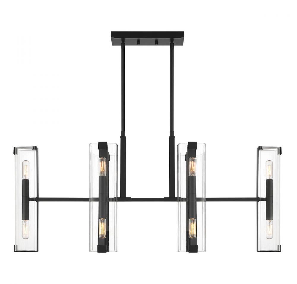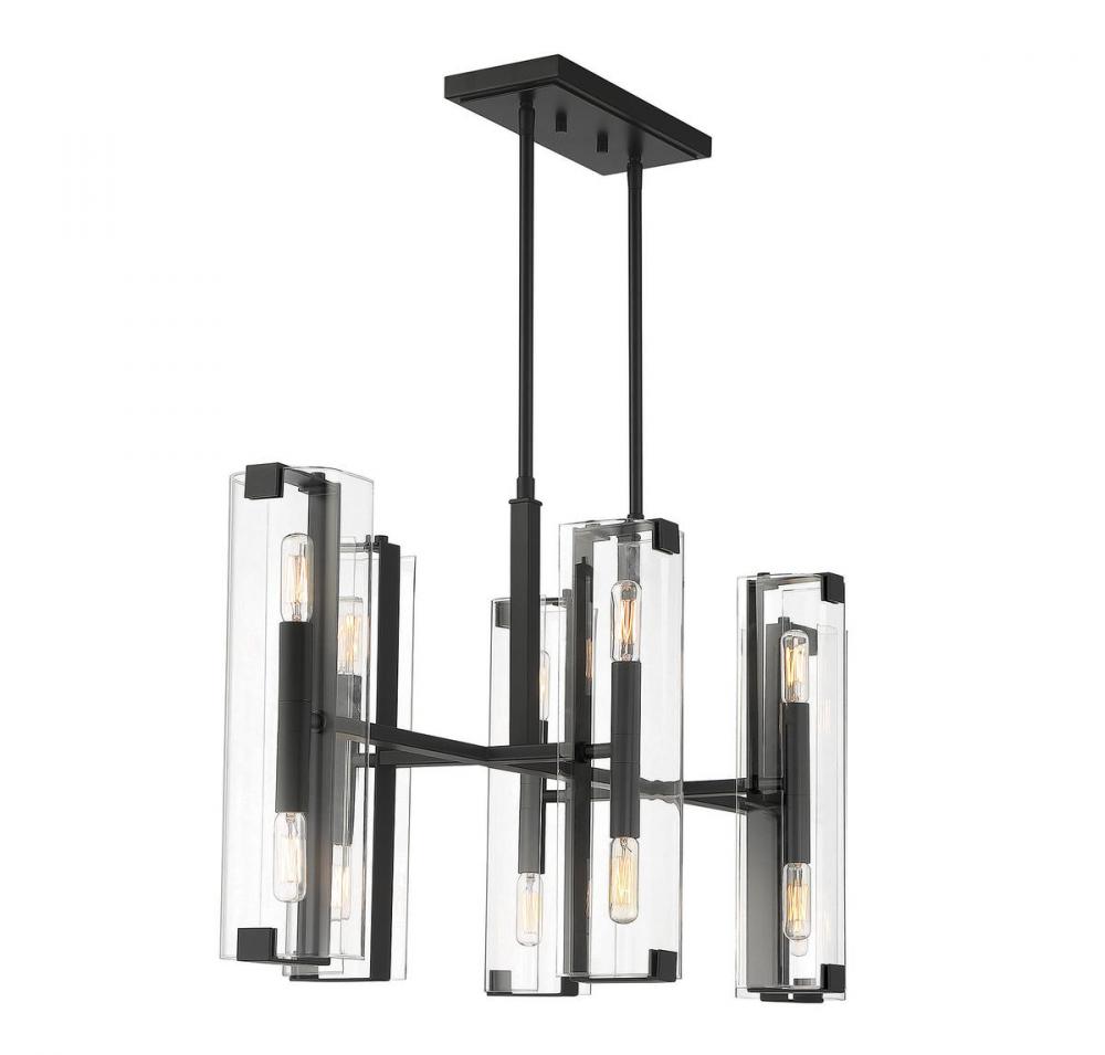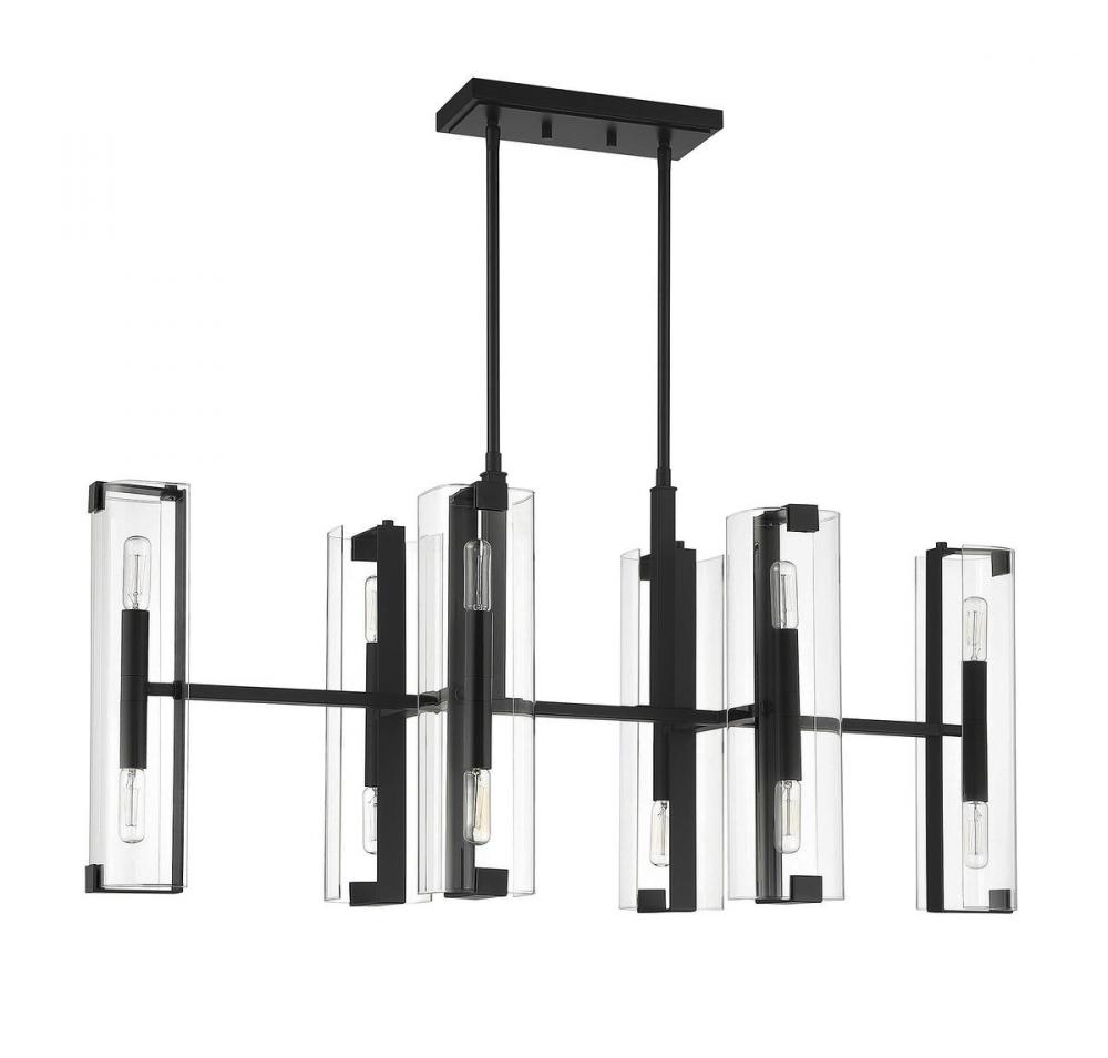 Sleek and sophisticated! The Savoy House Winfield 12-light linear chandelier has an eye-catching design, yet the clean lines and transparent glass keep the mood serene. Bold straight lines of the downrod, frame and bulb sockets are highlighted by the matte black finish. Each of the six light arms holds two 60W candelabra size bulbs, one facing up and one facing down, for splendid illumination through the pristine clear glass shades. This chandelier measures 38" long and has an adjustable height ranging from 23.25" to 69.75". Overall, it’s a chic and stylish fixture for your dining room, living room, entryway, kitchen island, family room, bar, office or media room.