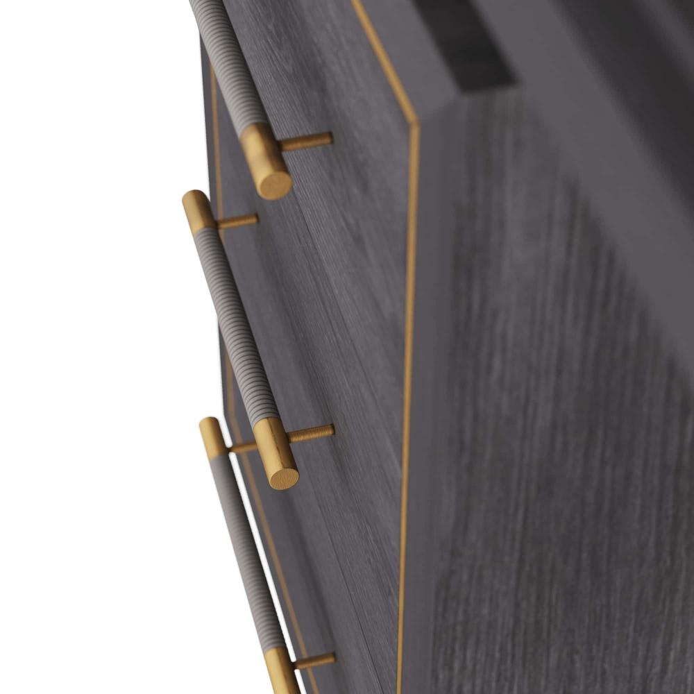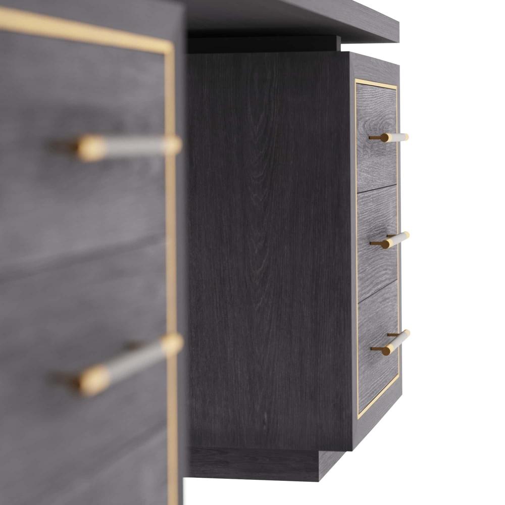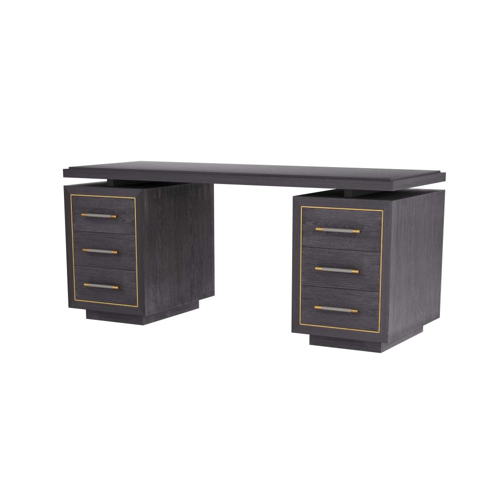 OUR DECO-INSPIRED WIXOM DESK IS LAVISHED WITH RICH DETAIL. CREATED IN EBONY OAK, THE STRIKING EXECUTIVE DESK IS DESIGNED WITH A CANTILEVERED DESKTOP THAT FLOATS ATOP TWO SETS OF DEEP DRAWERS, WHICH ARE FRAMED WITH ANTIQUE BRASS INLAYS. LINEAR ANTIQUE BRASS HARDWARE IS WRAPPED IN GRAPHITE LEATHER FOR ADDED FLOURISH. GRAY SUEDE LINES THE SIX STORAGE DRAWERS. FINISH WILL VARY. ASSEMBLY REQUIRED.