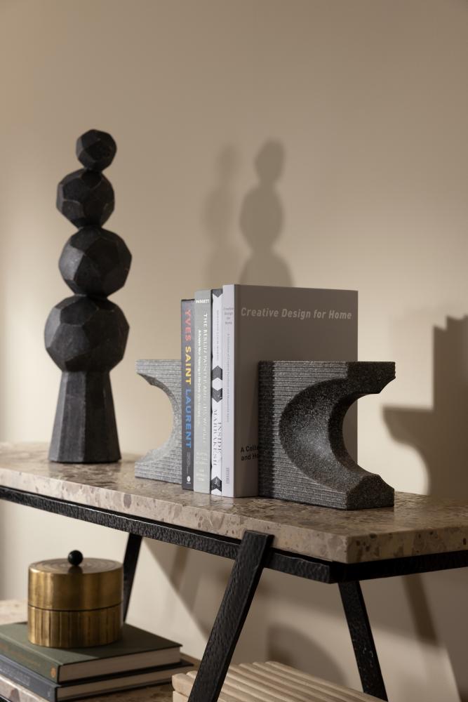 BRUTALIST INSPIRED, OUR WOLCOTT BOOKENDS, IN GRAPHITE RICESTONE COMPOSITE, FEATURE GRAPHIC CUTOUTS AND A CHISELED TEXTURE INSPIRED BY CONCRETE ARCHITECTURE OF THE PERIOD. THIS RICHLY SIMPLE PAIR CAN BE USED AS BOOKENDS OR STYLED TOGETHER AS SCULPTURE. FINISH WILL VARY.