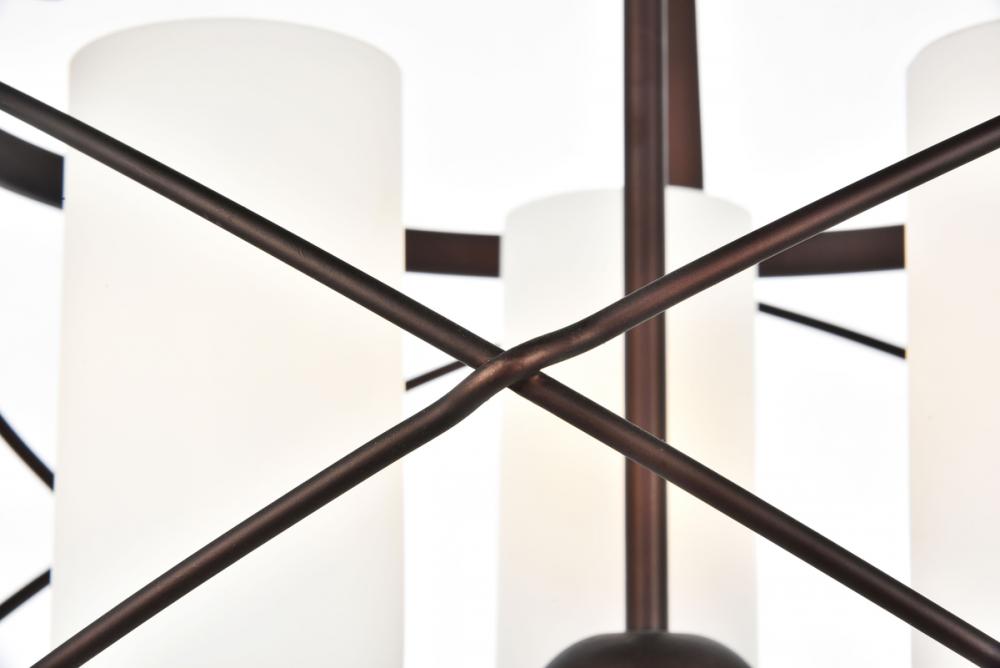 A playful composition with vintage appeal, Wren collection hanging fixtures are a unique blend of form and function. An oval Iron frame in a dark-copper brown finish connects to a stout chain and circular mounting fixture while Iron strips arch above and Iron Rods swirl around the sides. Nestled in the center, like eggs in a basket, three cylindrical frosted white Glass shades sit snugly atop curved arms. The perfect accompaniment for rustic or nautical décor in a living room, office, or bedroom.