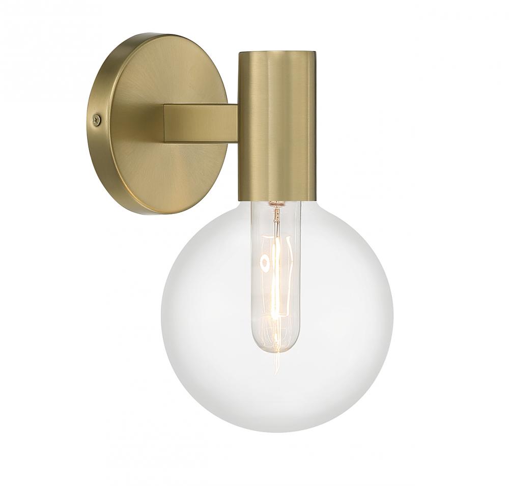 This Savoy House Wright 1-light sconce showcases streamlined style that makes it ideal for any space. A round clear glass shade adds an extra dimension and extra protection for the light bulb within. Warm brass finish. Wright is 10" in height, 5.75" in width and extends 7.5" from the wall. Uses 1 standard size bulb with a max of 60 watts (bulb not included). We recommend using a tubular shaped bulb.