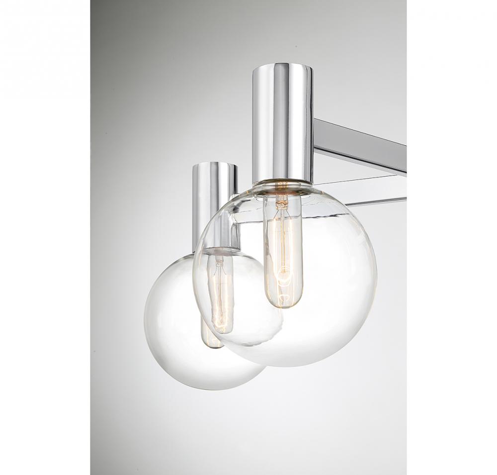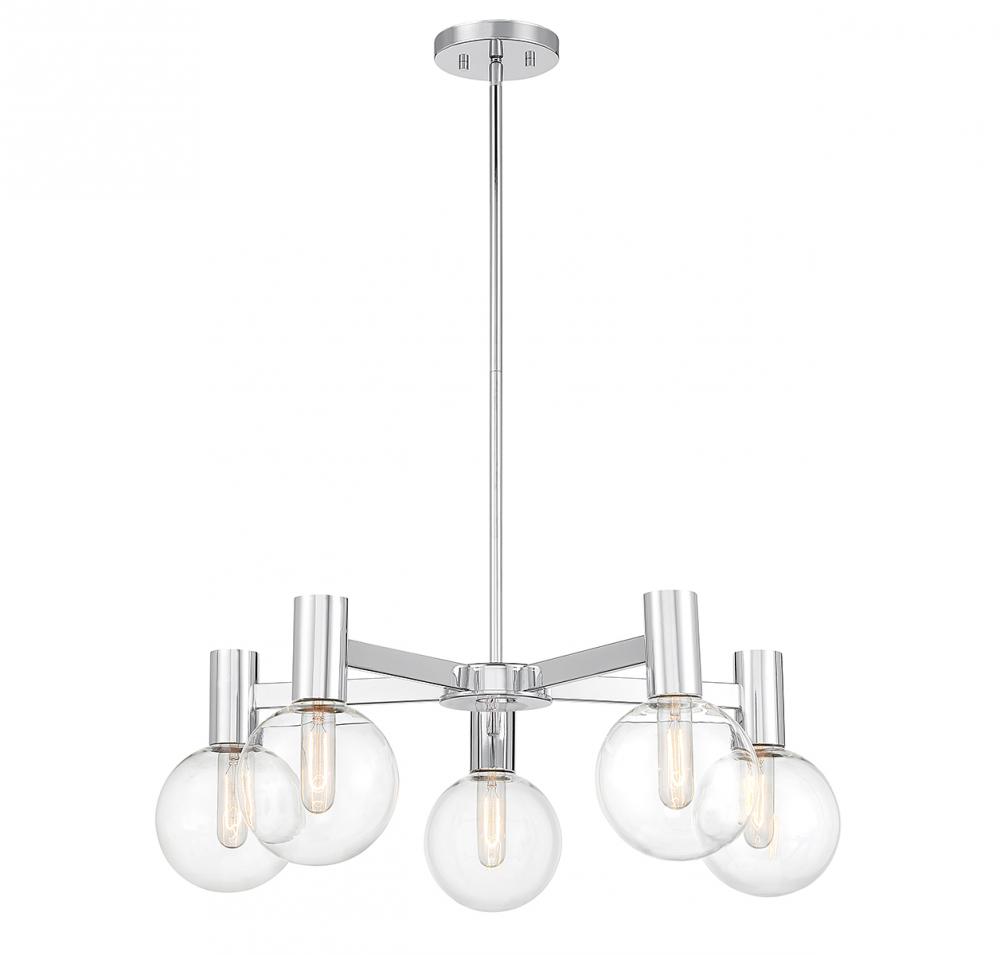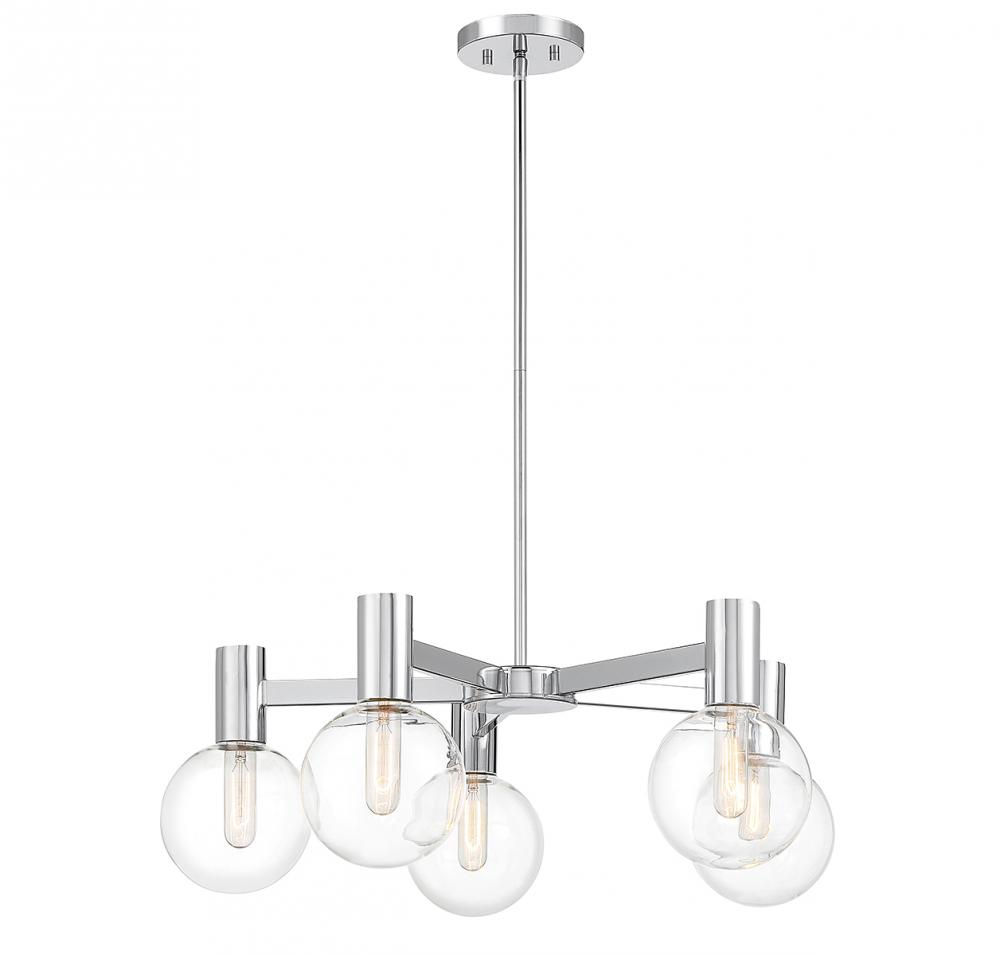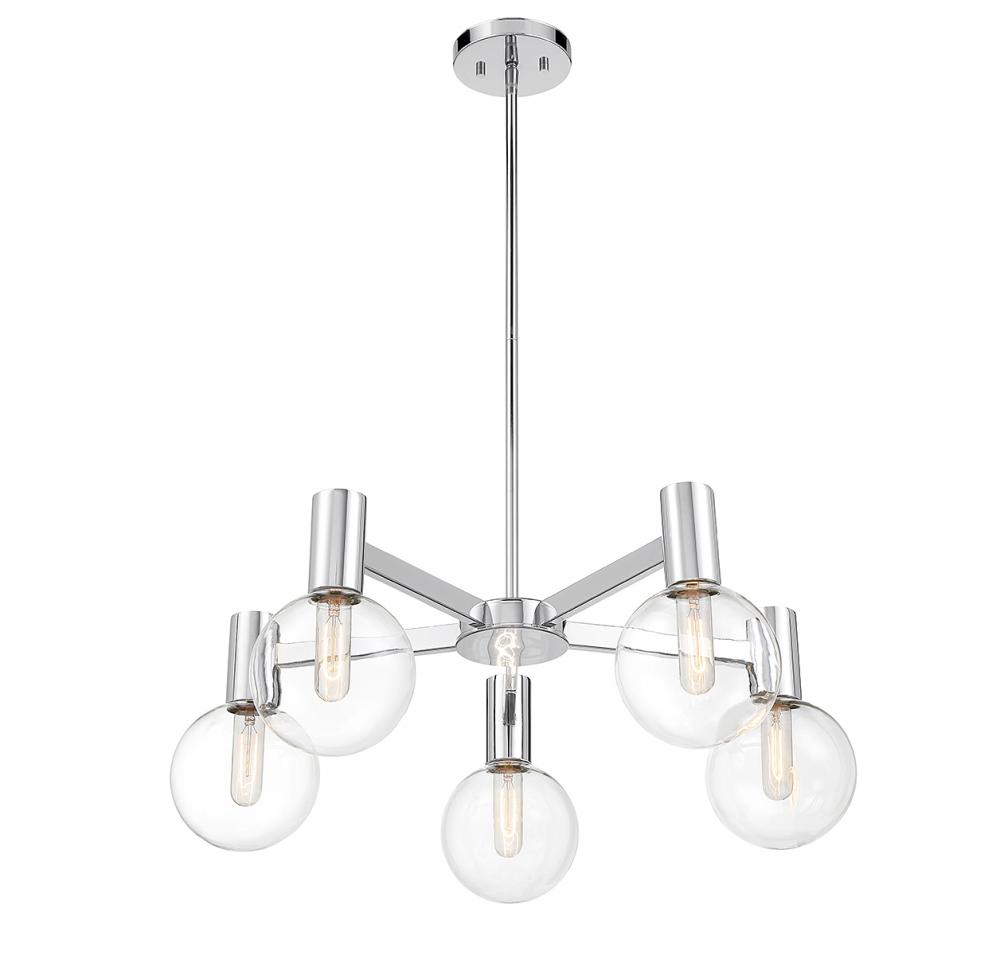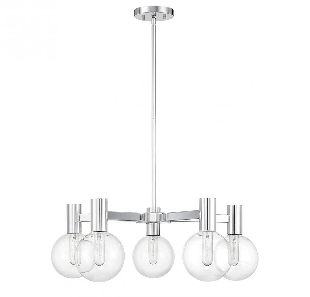 This Savoy House Wright 5-light chandelier showcases streamlined style that makes it ideal for any space. Round clear glass shades add an extra dimension and extra protection for the light bulbs within. Chrome finish. Wright is 28" in width and has an adjustable height ranging from 10.5" to 64". Comes with four 12" downrods and one 6" downrod. Uses 5 standard size bulbs of up to 60 watts per bulb (bulbs not included). We recommend using tubular shaped bulbs.