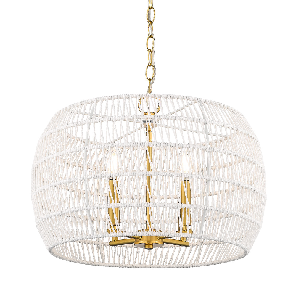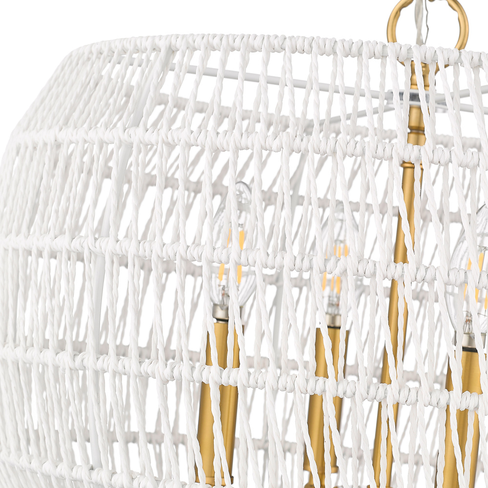 Bring coastal elegance into your home with the Wry Lighting Ellie 4-light Chandelier. Featuring a rope shade and a modern brushed gold frame, it creates a welcoming atmosphere. The bleached white raphia rope shade offers a clean, bright, and textural look, reminiscent of sun-bleached rope found on a tropical beach. This artisanal material enhances the chandelier's relaxed coastal feel while beautifully diffusing light. Our modern brushed gold finish radiates warmth and has a luxe appeal, treated with a fine brushing that creates a sophisticated surface. Make a grand impression in dining rooms and foyers or elevate bedrooms and living spaces with a touch of classic elegance. This fixture is damp location rated, suitable for covered areas with occasional moisture. The convertible design allows for adjustable height installation on sloped or flat ceilings, ensuring a perfect fit in any space. Overall Dimensions: 19"W x 13.5"H x 19"D, Requires 4 E12 Candelabra base bulbs (not included), max 60 watts per bulb. With its timeless design and quality craftsmanship, this chandelier is perfect for those seeking to add a chic yet relaxed vibe to their home.