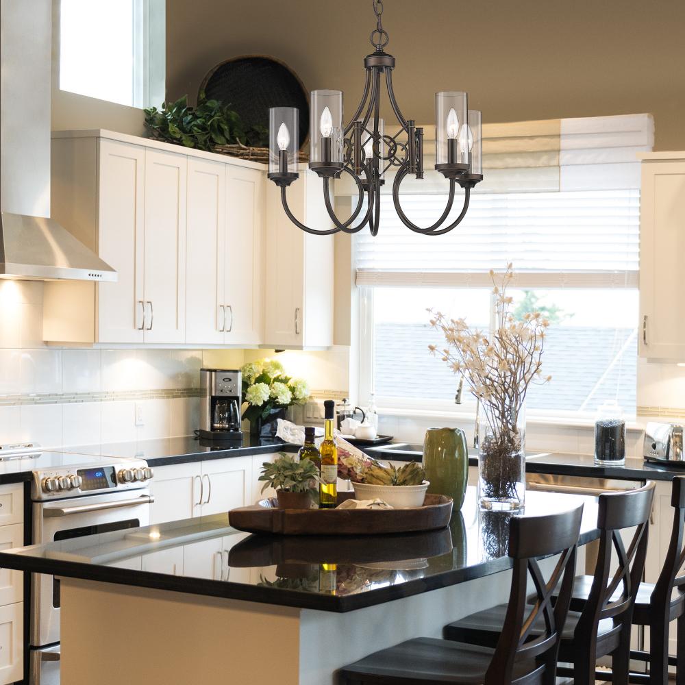 Bring transitional elegance into your home with the Wry Lighting Quincy 5-light Chandelier. Featuring a glass shade and a Cordoban Bronze frame, it creates a welcoming atmosphere. The clear glass shade offers brilliant, unobstructed light, allowing the beauty of the bulb and the fixture's design to shine. Its smooth, polished finish complements a wide array of styles. Inspired by the rich, hand-rubbed leathers of old-world Spain, the Cordoban Bronze finish adds warmth and artisan character, making it a timeless choice. Perfect for dining rooms, foyers, bedrooms, and living spaces, the chandelier is dry location rated, making it ideal for indoor spaces not subject to moisture. It is sloped-ceiling compatible and features an adjustable height ranging from 21.625" to 93.625". Overall dimensions are 22.63"W x 20.63"H x 22.63"D, and it requires 5 E12 candelabra base bulbs (not included, max 60 wattage per bulb). Elevate your decorative style with the Wry Lighting Quincy Chandelier, a beautiful blend of sophistication and functional lighting.
