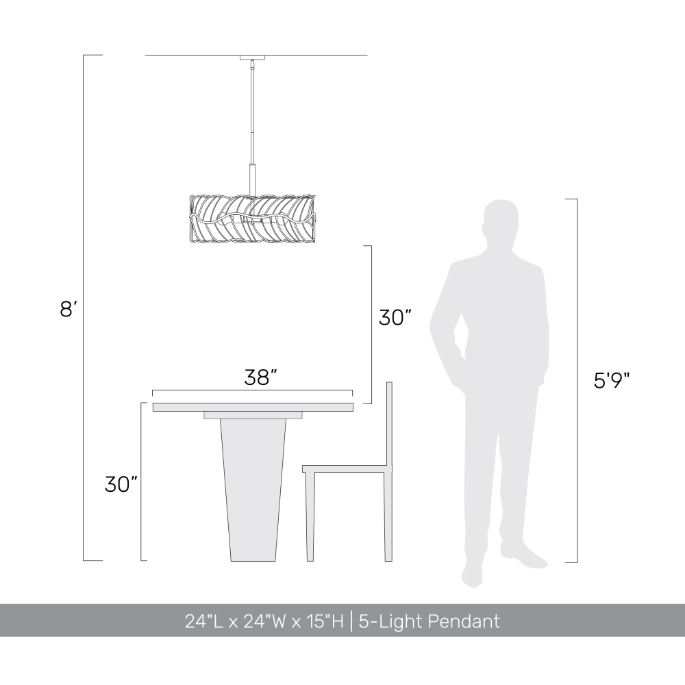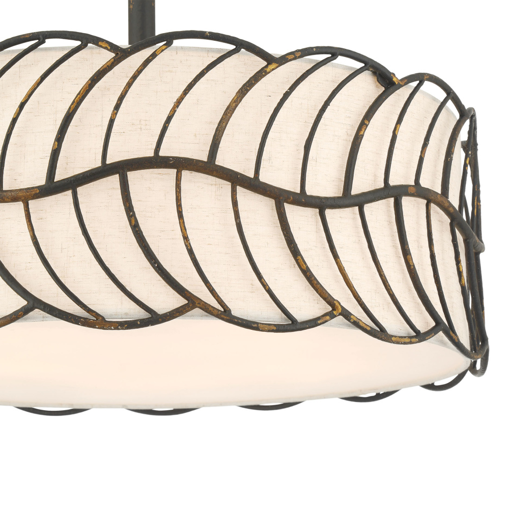 Bring farmhouse elegance into your home with the Wry Lighting Simbolo 5-light Pendant in Antique Black Iron. Featuring a fabric shade and a rugged Antique Black Iron finish, it creates a welcoming atmosphere. The ivory linen fabric shade provides a soft, tailored look, skillfully diffusing light to enhance your space with a warm glow. This timeless hue and natural texture ensure that your lighting feels both relaxed and refined. The Antique Black Iron finish captures the authentic charm of a bygone era, showcasing a heavily pitted and crackled surface for added character. Its industrial appeal perfectly complements rustic and farmhouse designs. Ideal for dry locations like bedrooms, living rooms, and hallways, this pendant is easily adjustable in height and compatible with sloped ceilings, ensuring seamless installation. Overall dimensions are 24"W x 15"H x 24"D, and it requires 5 E26 Medium base bulbs (not included), max 60 wattage per bulb. Elevate your home with artisanal craftsmanship and a touch of age-old charm.