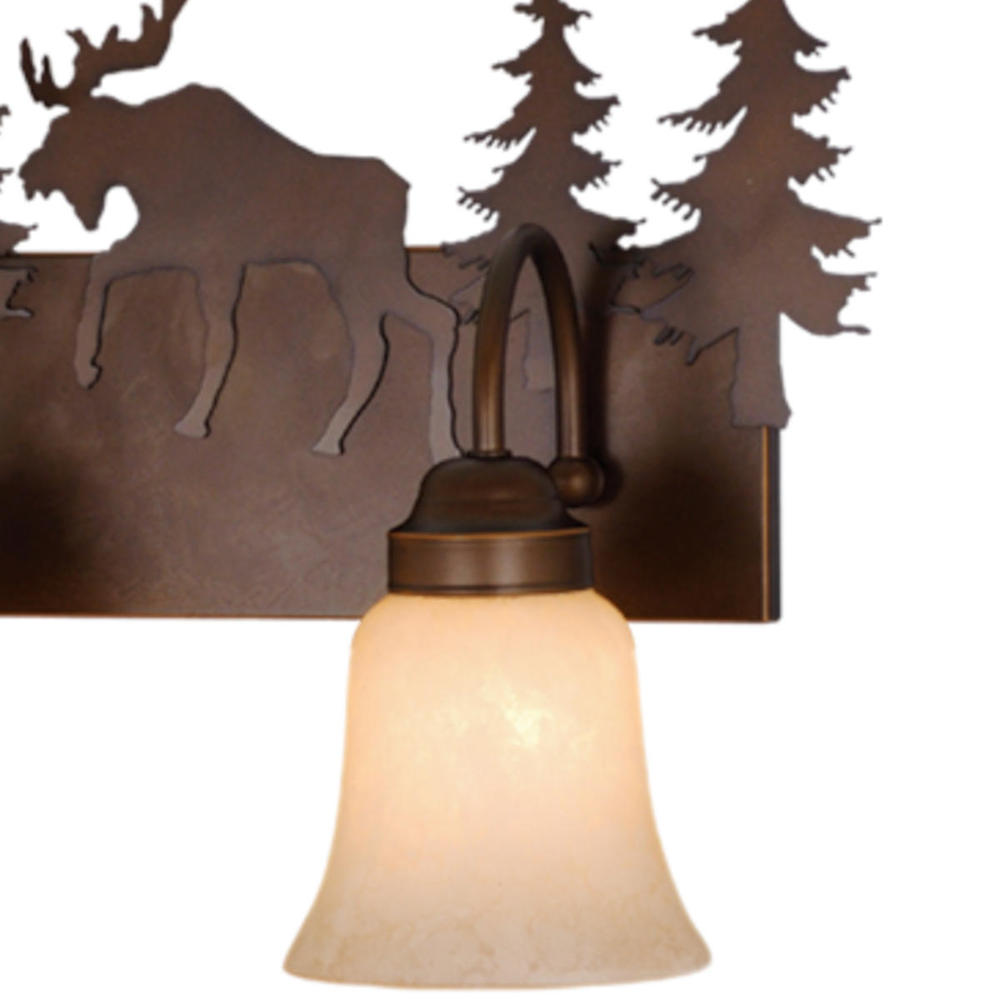 Evoking the spirit of the wilderness, this rustic themed light is clad in a burnished bronze finish and features silhouetted moose imagery atop glowing amber flake glass. It is a great choice for a vacation lodge, cabin or suburban home and will complement a variety of home styles: anywhere you want to bring an element of nature. This bathroom light is perfect over small vanities or as a pair over double sinks. The full back plate creates the perfect solution to any space where a larger back plate is needed.