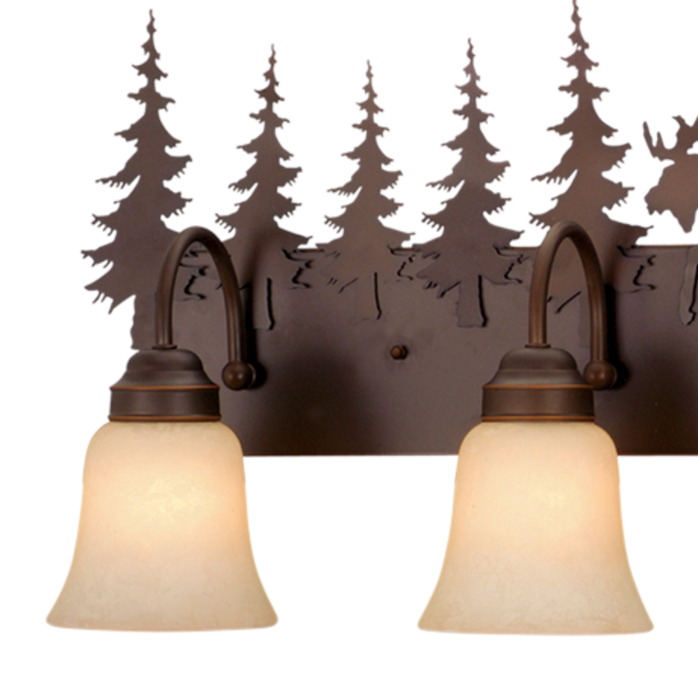 Evoking the spirit of the wilderness, this rustic themed light is clad in a burnished bronze finish and features silhouetted moose imagery atop glowing amber flake glass. It is a great choice for a vacation lodge, cabin or suburban home and will complement a variety of home styles: anywhere you want to bring an element of nature. This bathroom light is perfect over large or double vanities where there is only one outlet box. The full back plate creates the perfect solution to any space where a larger back plate is needed.